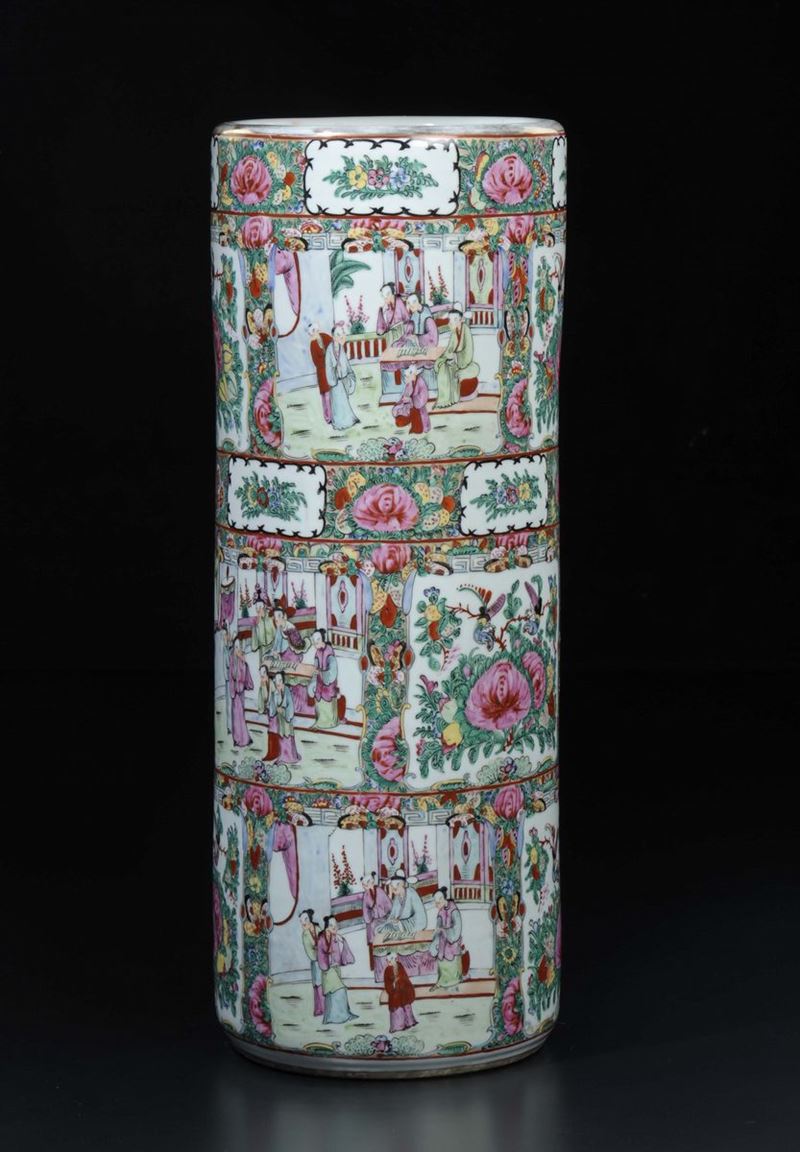 A cylinder polychrome enamelled porcelain vase with flowers and court life scenes, China, 20th century
