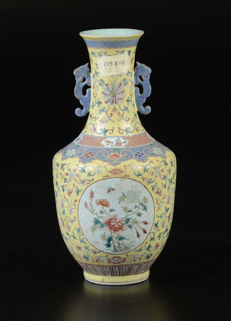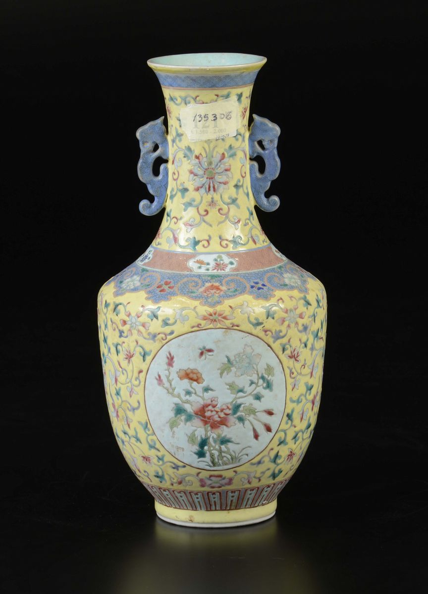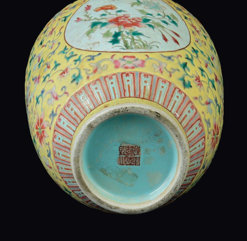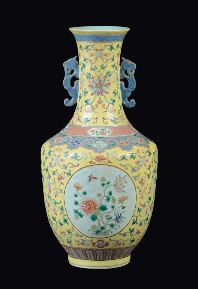 A Famille-Rose yellow-ground vase with flowers within reserves, China, Qing Dynasty, 19th century