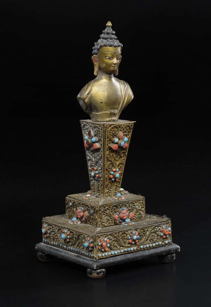 A gilt bronze Budha bust with coral and turquoise inlays, Tibet, 19th century