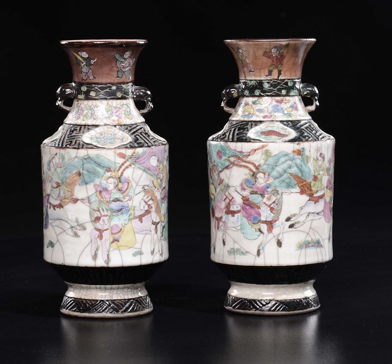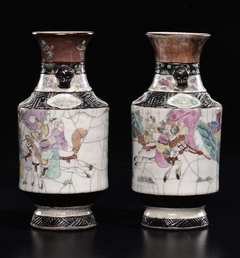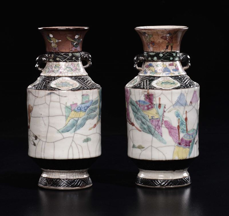 A pair of craquelè polychrome enamelled porcelain vases with battle scenes, China, Qing Dynasty, 19th century