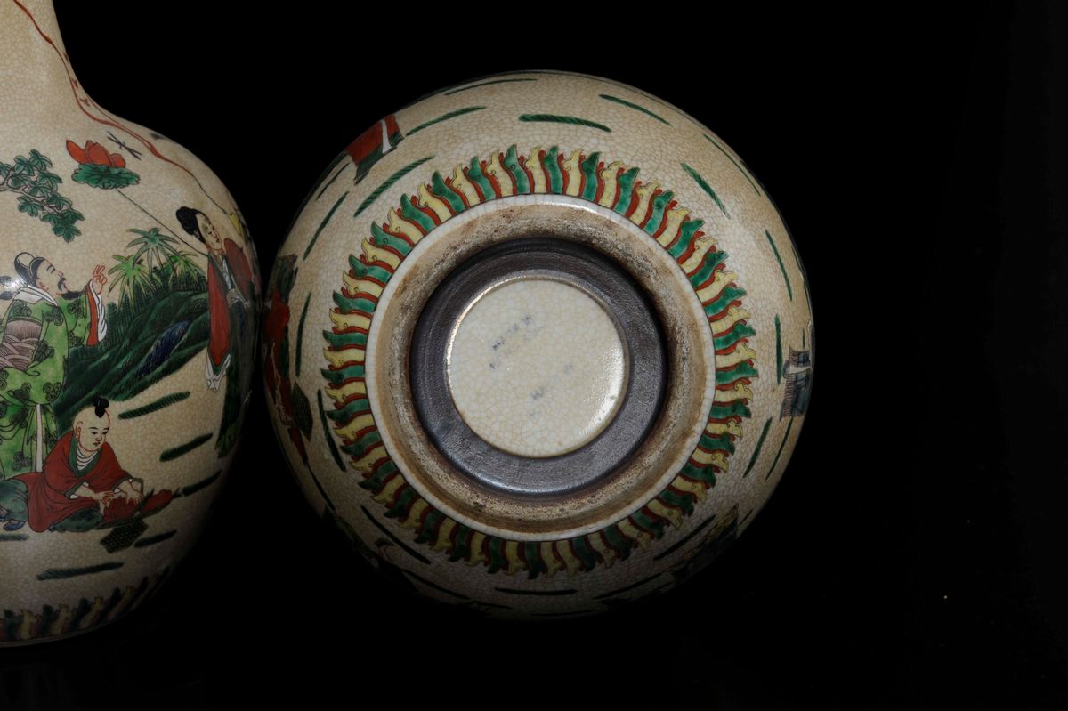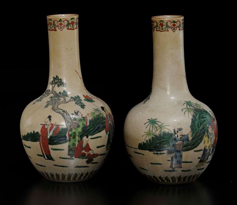 A pair of craquelè porcelain vases with common life scenes, China, Qing Dynasty, 19th century