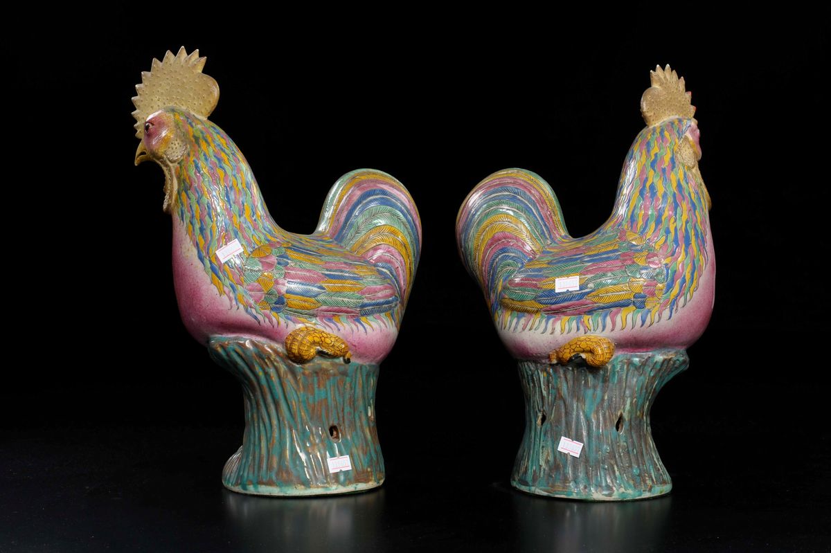 A pair of polychrome enamelled porcelain roosters, China, Qing Dynasty, 19th century