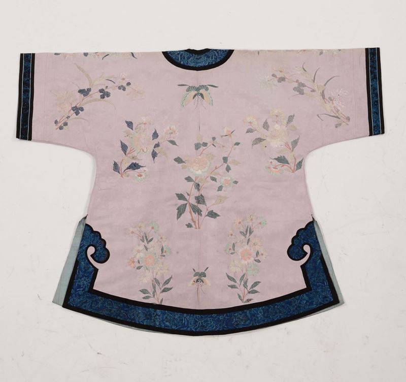 A pink-ground silk dress with flowers and butterflies, China, Qing Dynasty, 19th century