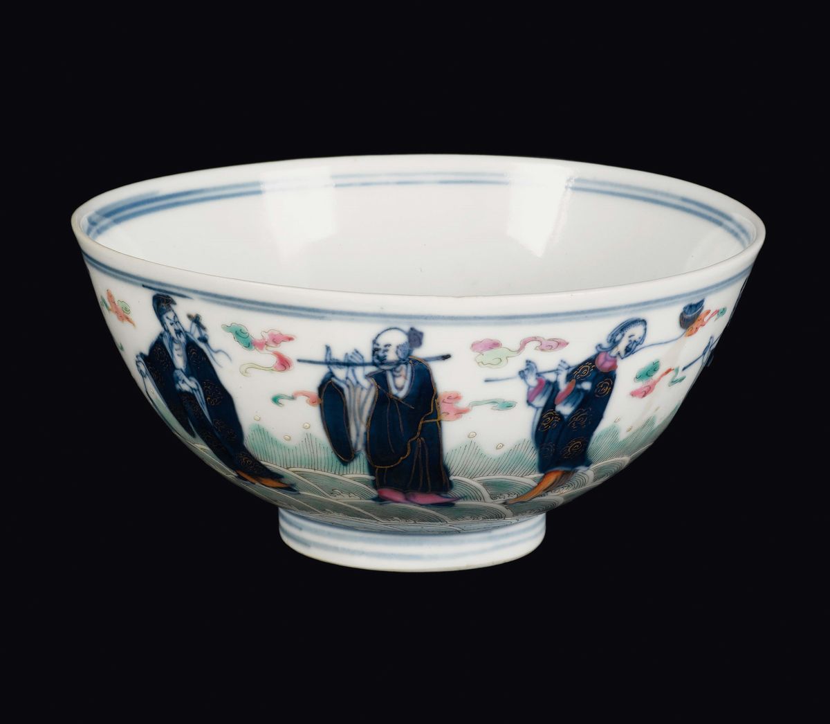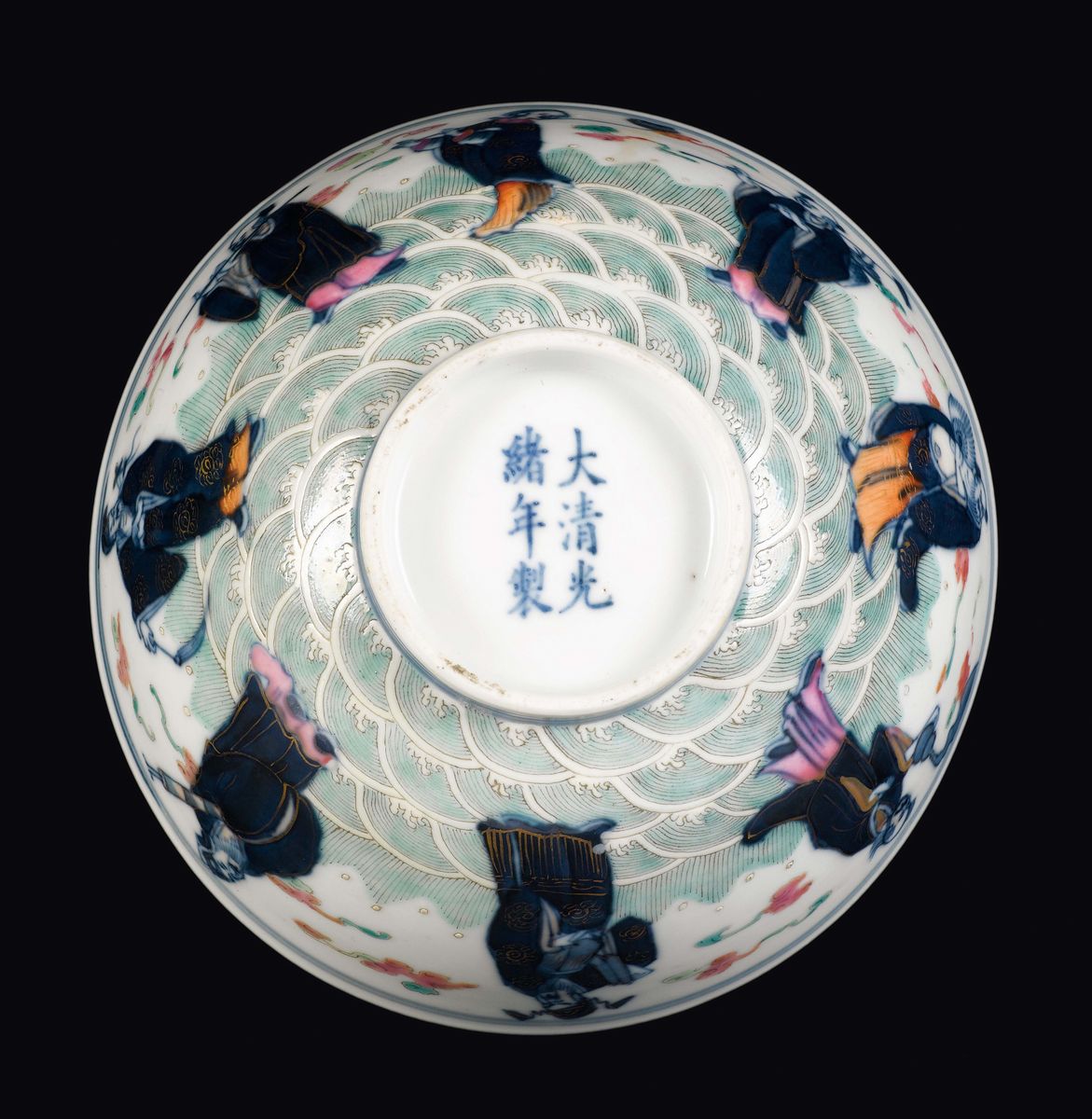 A polychrome enamelled bowl with figures, bats and an inscription, China, Qing Dynasty, Guangxu Mark and Period (1875-190 [..]