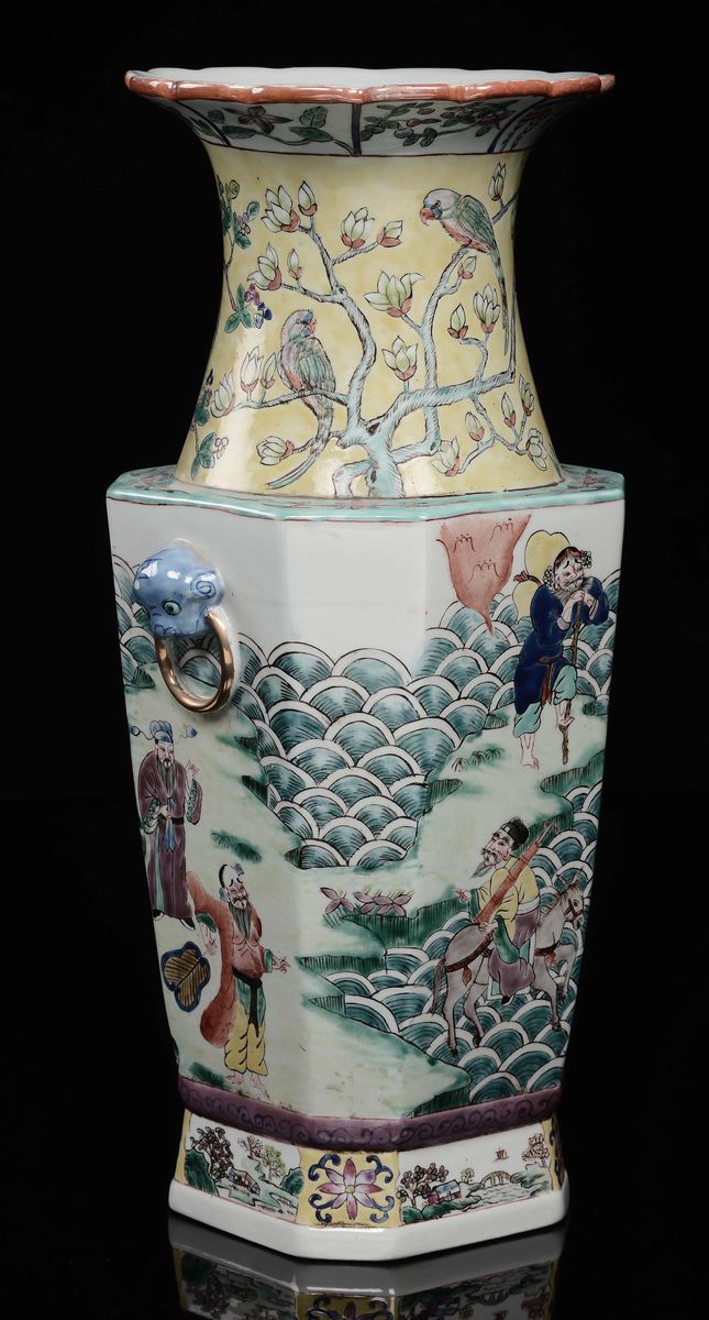 A polychrome enamelled porcelain vase with common life scenes and birds on peach branches, China, Qing Dynasty, late 19th [..]