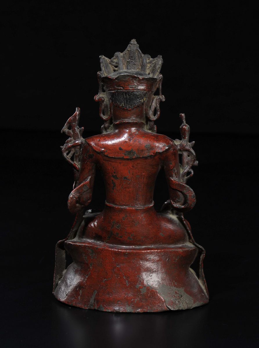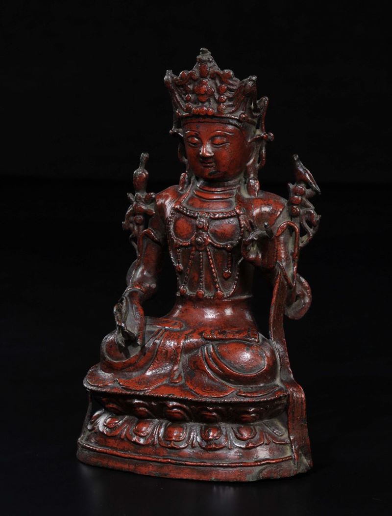 A red glazed bronze figure of Bodhisatteva sitting on a double lotus flower, China, Ming Dynasty, 17th century