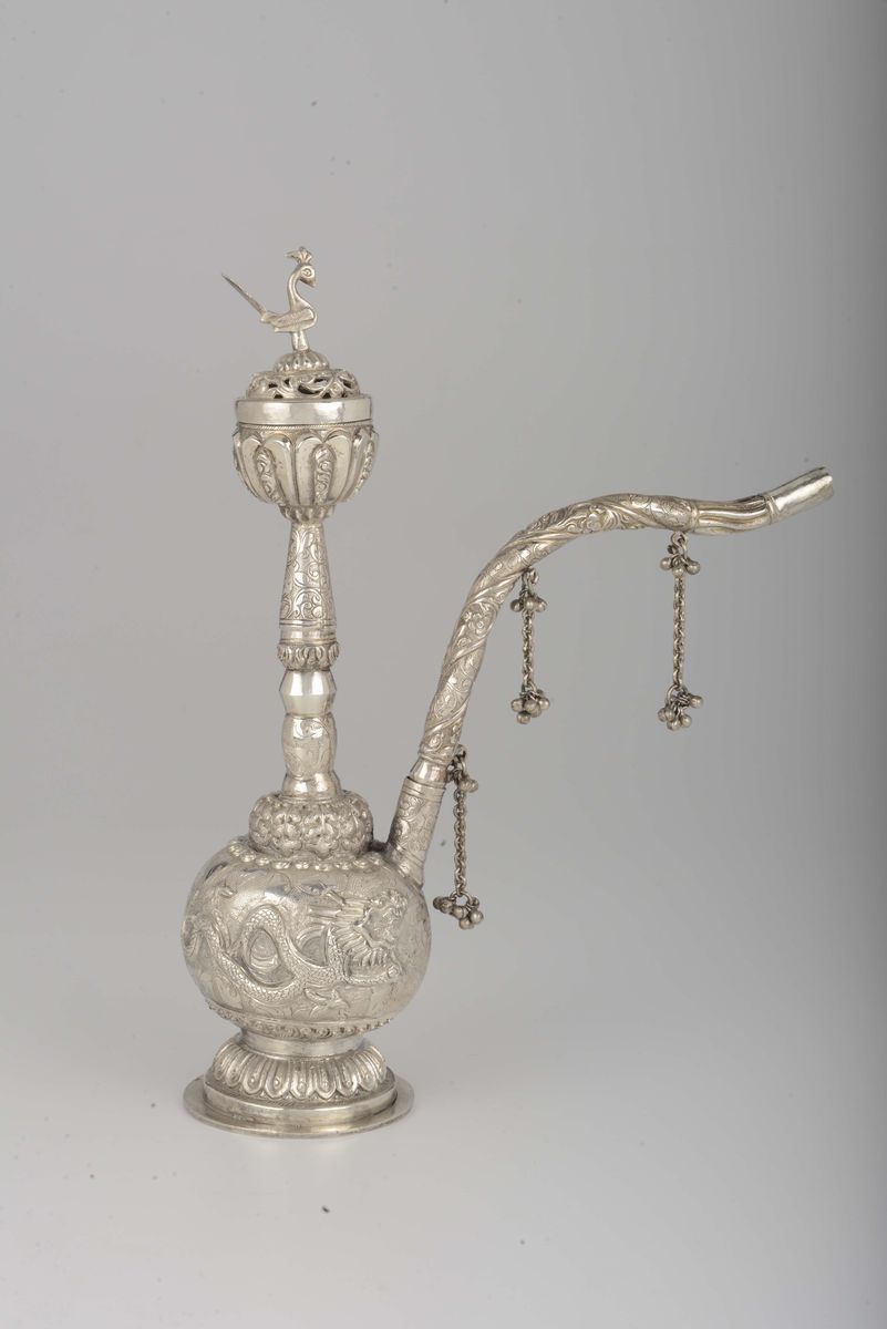 A silver pipe with dragons in relief and small bells on the spout, Tibet, 19th century