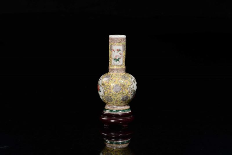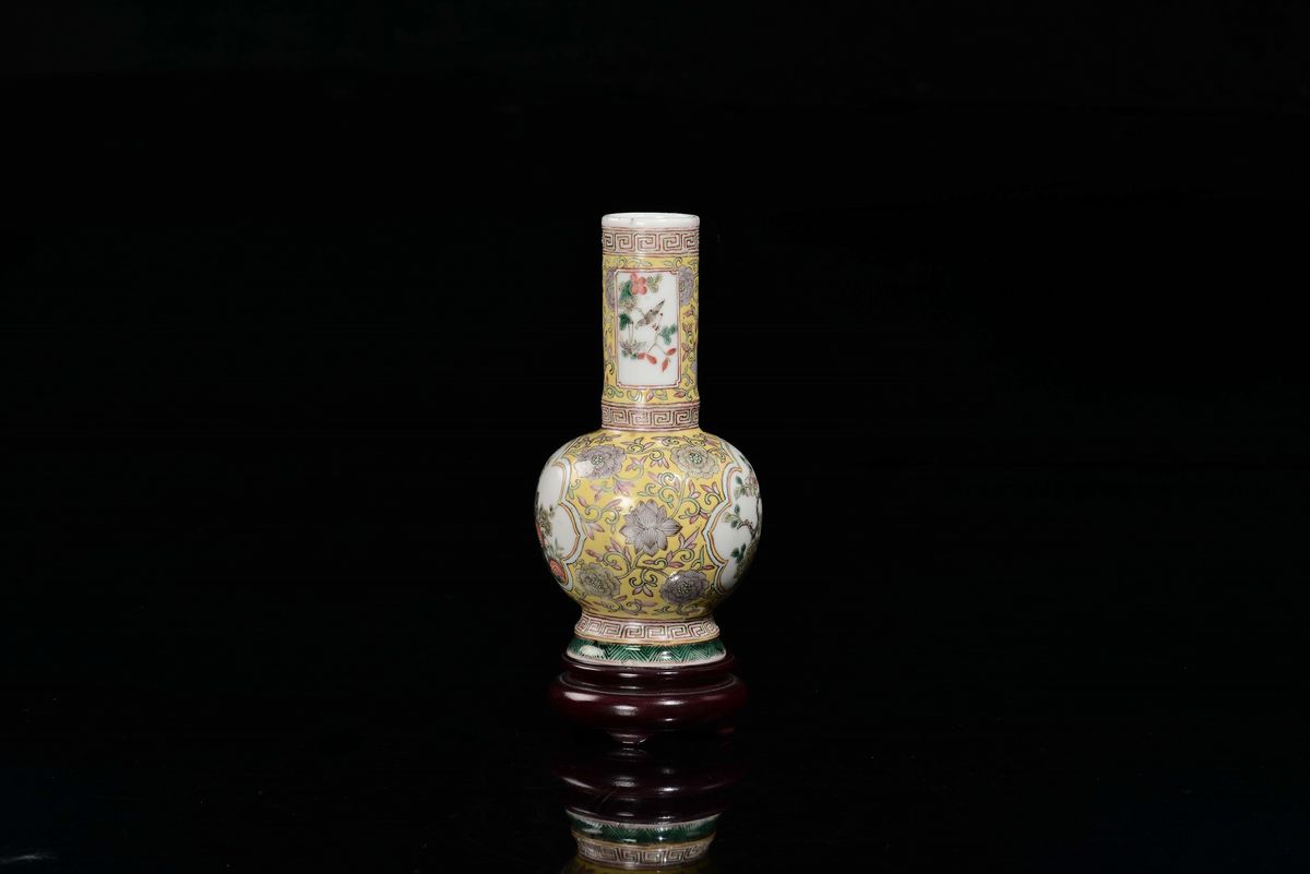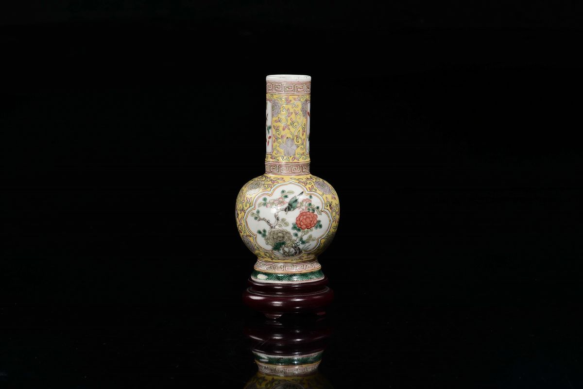 A small polychrome enamelled porcelain vase yellow-ground with peacock and magpie within reserves, China, 20th century