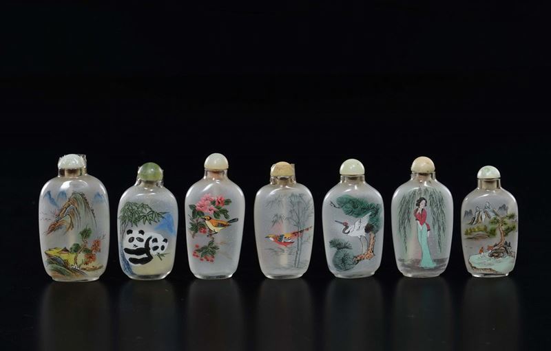 Seven painted glass snuff bottles with landscapes and animals, China, 20th century