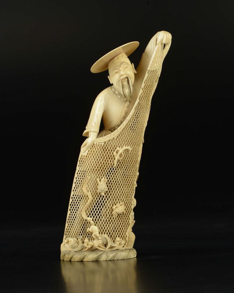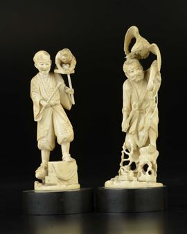 Three carved ivory figures, an hawker, a fisherman and a monkeys' trainer, Japan, early 20th century