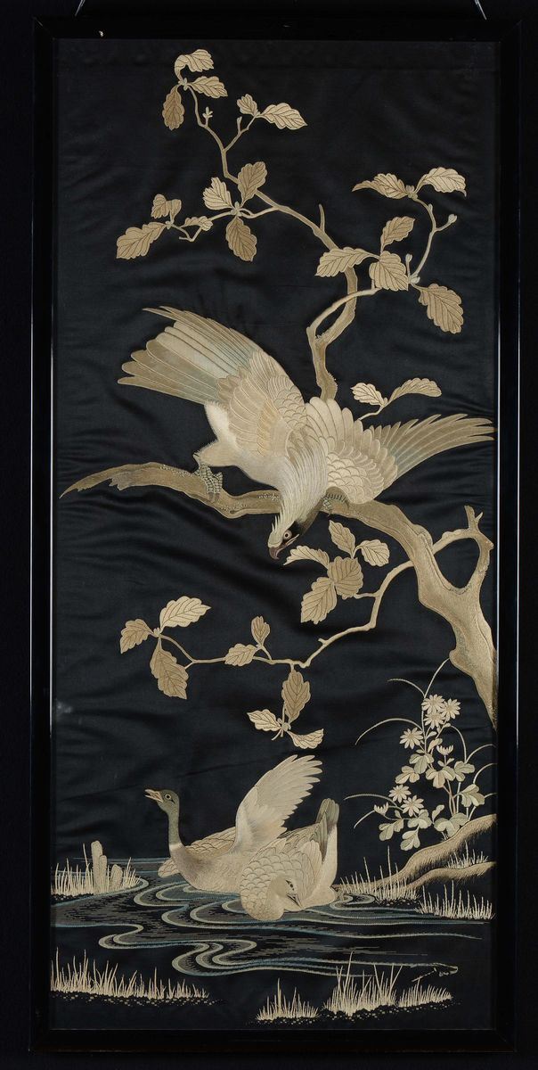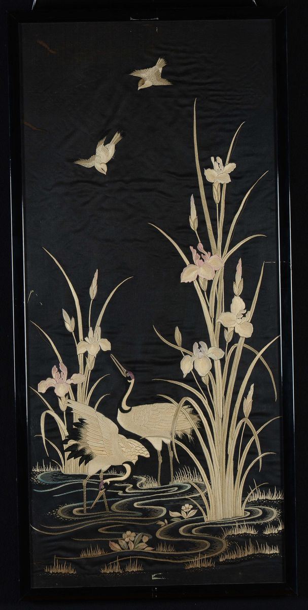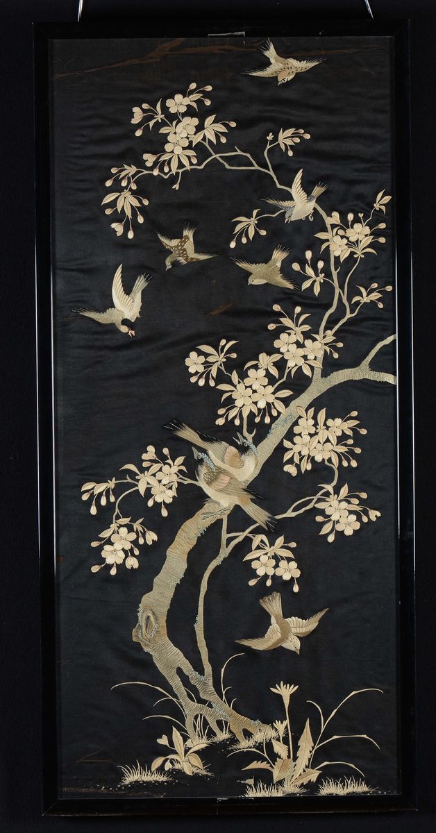 Three framed silk black-ground clothes embroidered with birds and flowering branches, Japan, 20th century