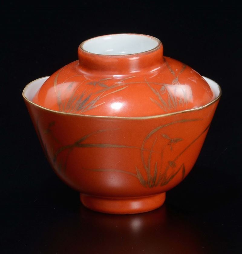 Three polychrome enamelled porcelain cups and cover with naturalistic decorations and inscriptions, China, Qing Dynasty, 19th century