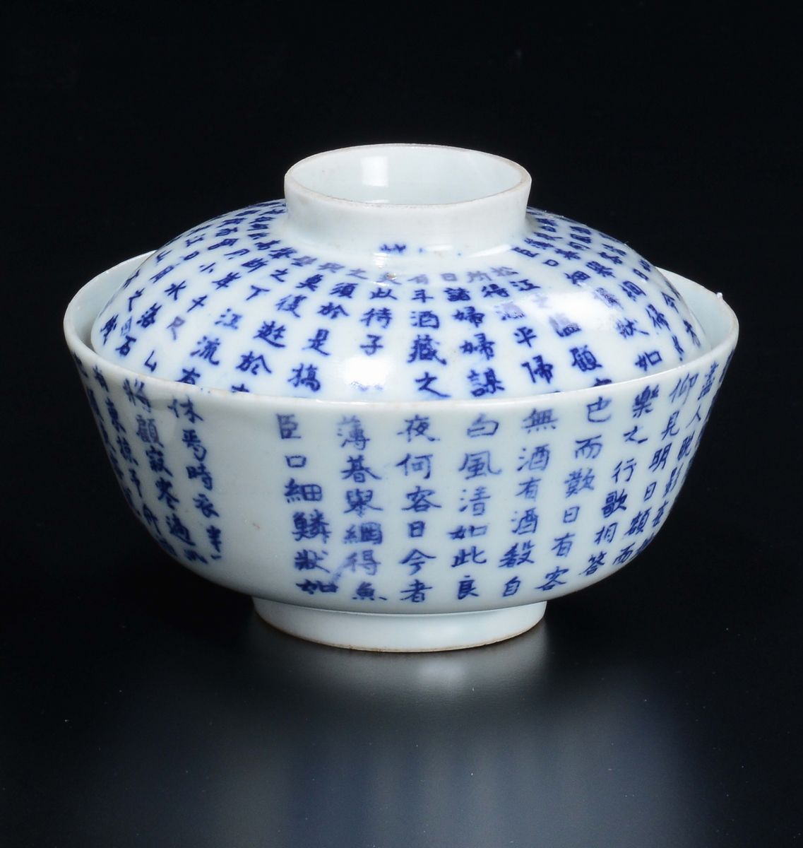 Three polychrome enamelled porcelain cups and cover with naturalistic decorations and inscriptions, China, Qing Dynasty, [..]