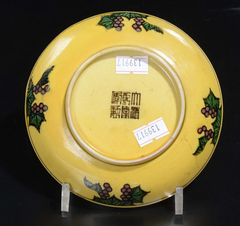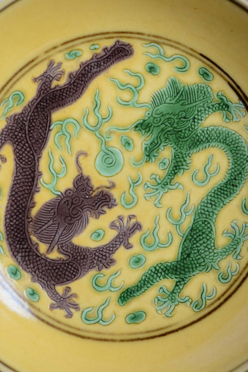 Three yellow-ground porcelain dishes with dragons, China, Qing Dynasty, 19th century
