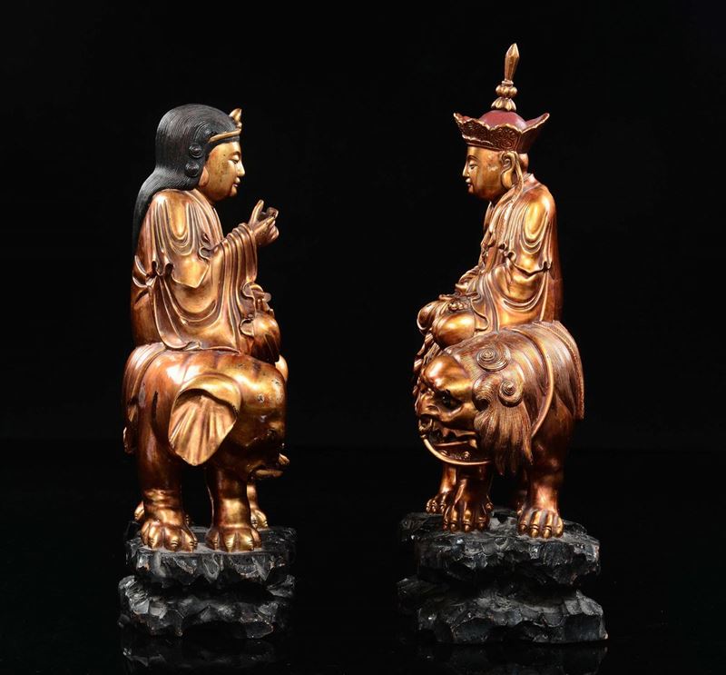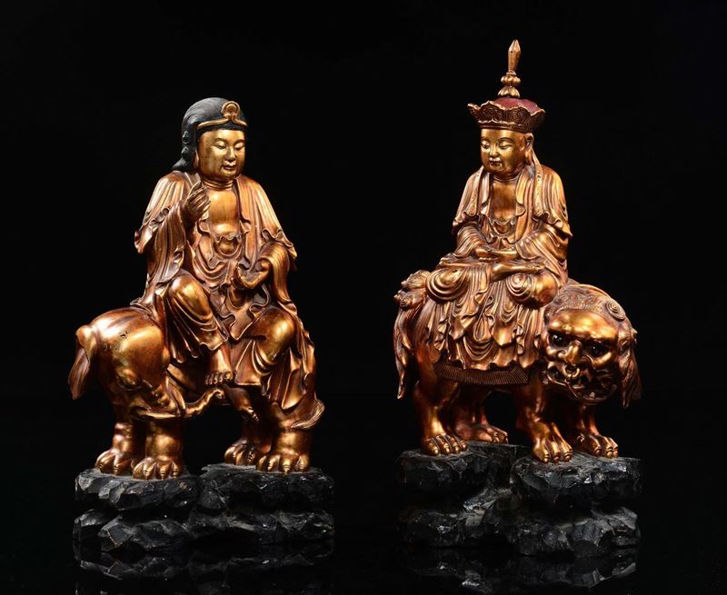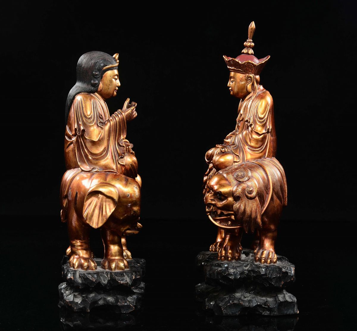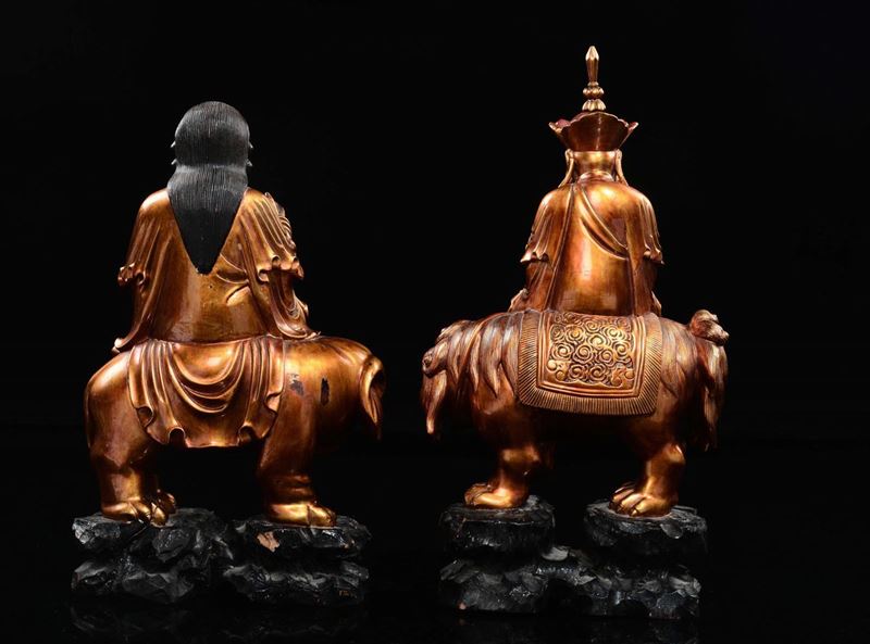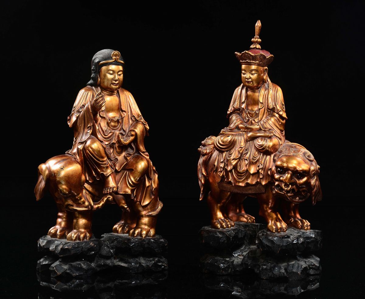 A pair of gilt lacquered wooden figures sitting on elephant and Pho dog, China, Qing Dynasty, 18th century