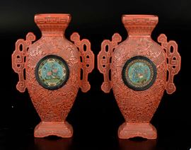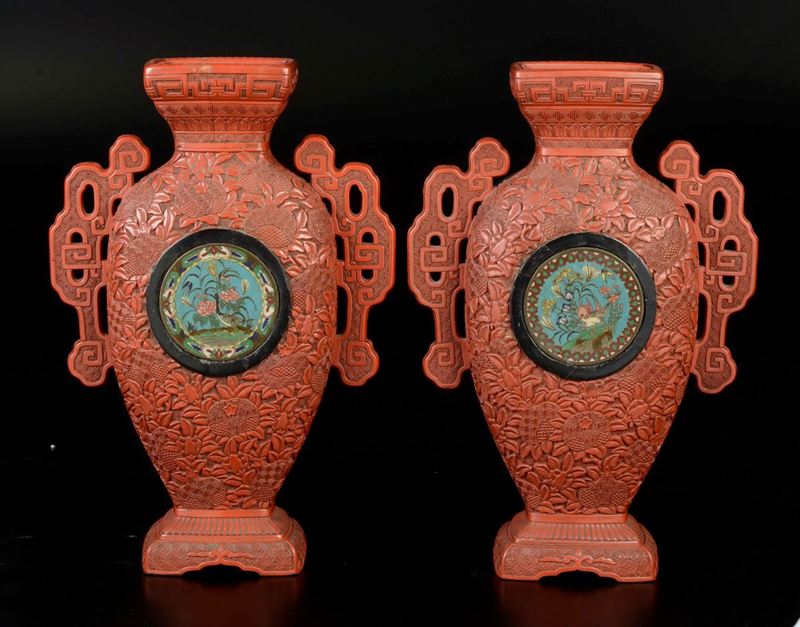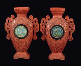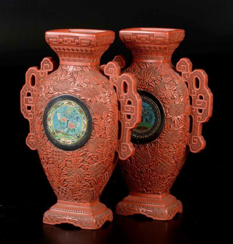 A pair of red lacquer double handles vases with carved naturalistic decoration and flowers and birds within reserves, China, [..]