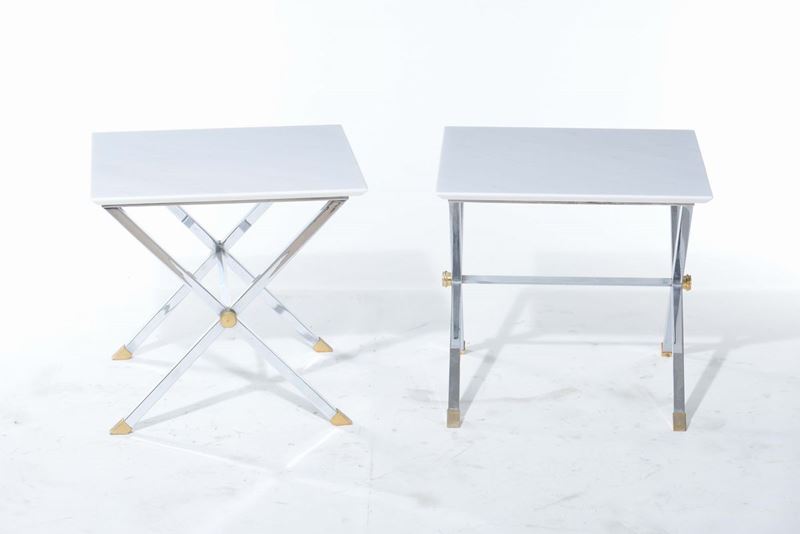 Coppia di tavolini con struttura in metallo cromato, finiture in ottone e piano in marmo. Prod. Italia, 1960