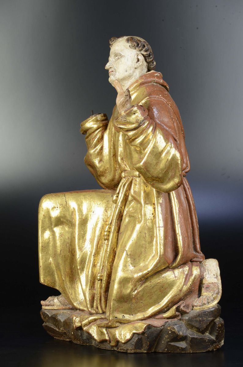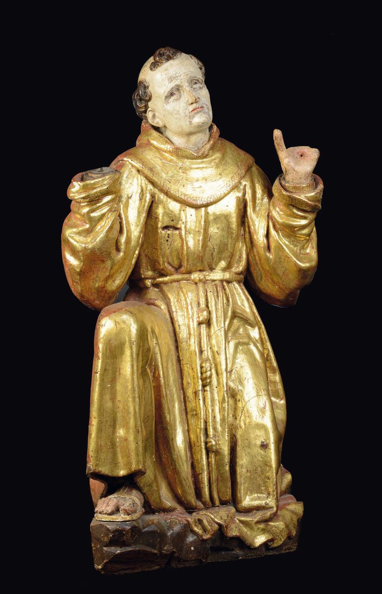 A polychrome and gilt wood St Frances receiving the stigmata sculpture, Spanish sculptor, 16th century
