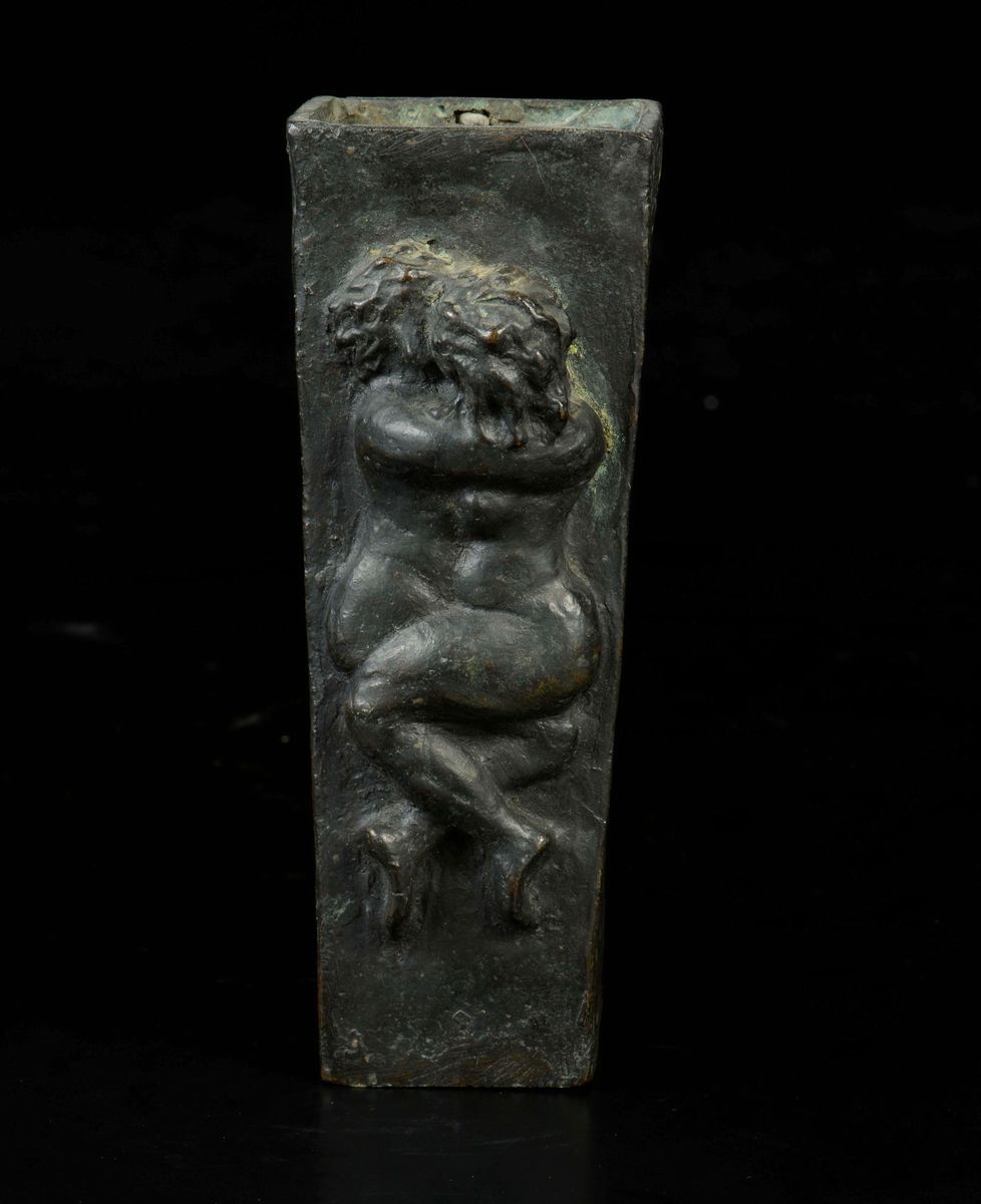 Vaso in bronzo a sezione quadrata con altorilievo e frasi latine incise. Altezza cm 18