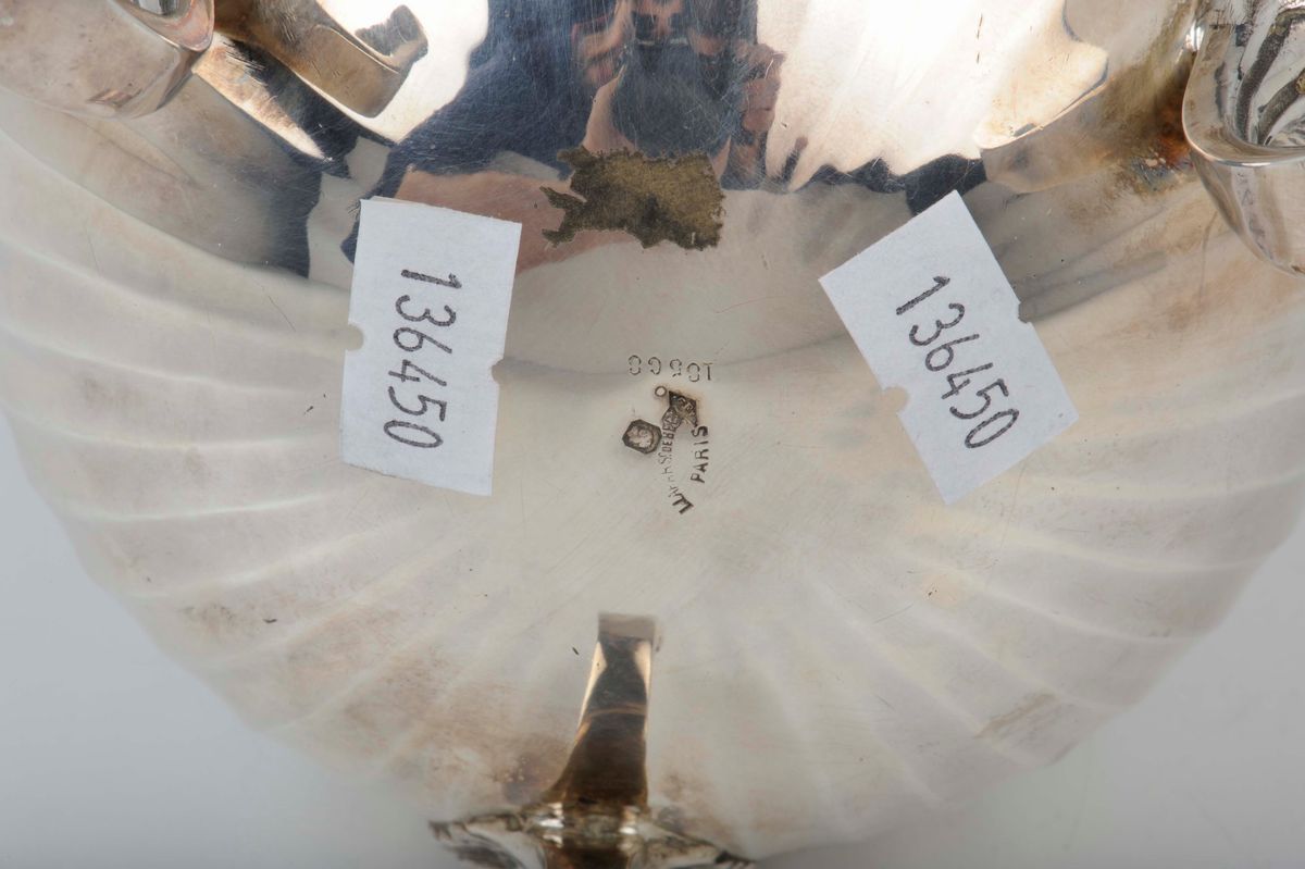 corpo piriforme decorato a rastremature poggiante su tre piedini a voluta; alto beccuccio con festoni e manico laterale in ebano, incussa iscrizione con nome dell'argentiere e dicitura Paris, gr. 690, altezza cm 25