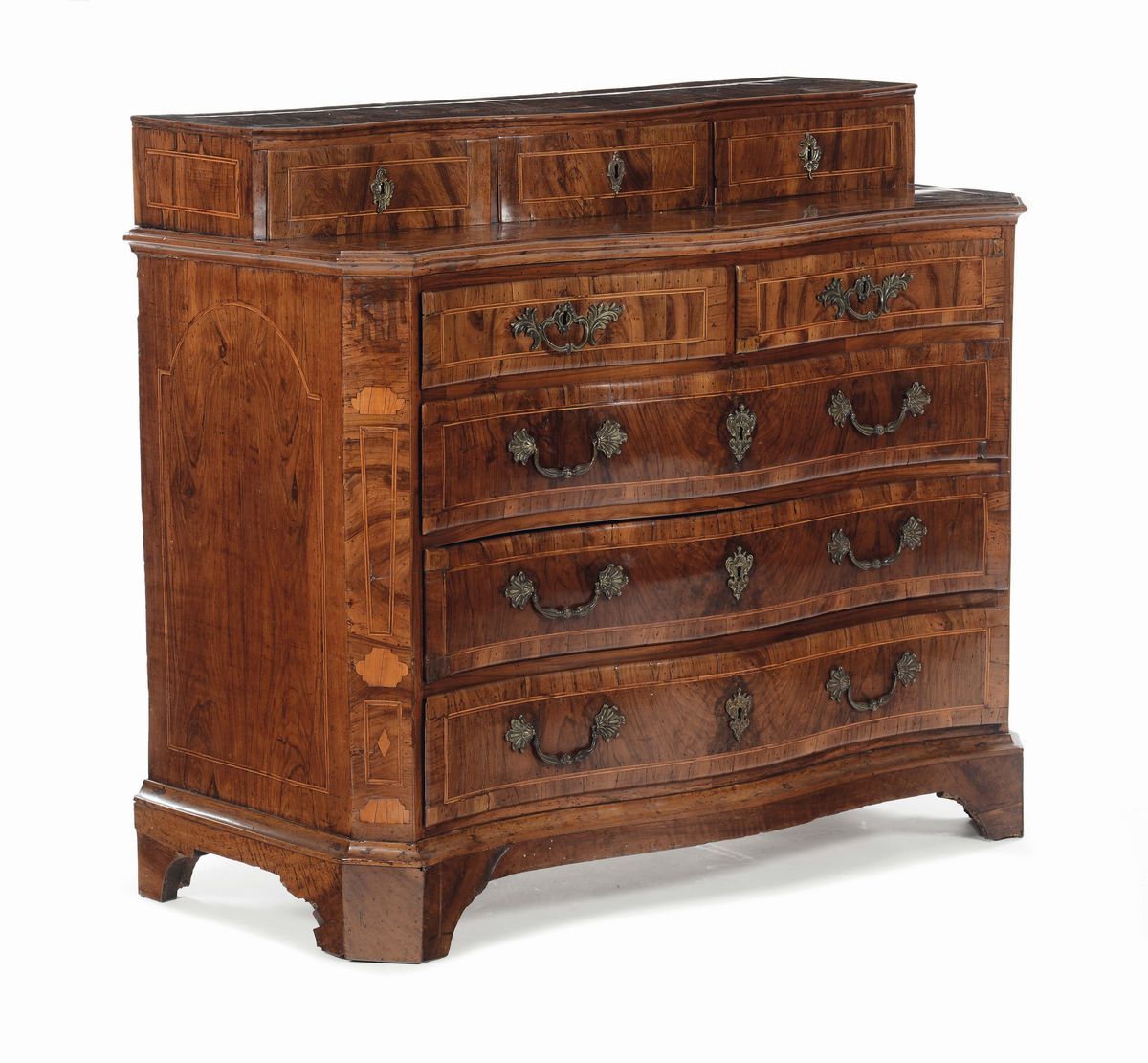 fronte mosso a quattro cassetti, piano con alzatina a tre cassettini, fianchi dritti, cm 126x59x110