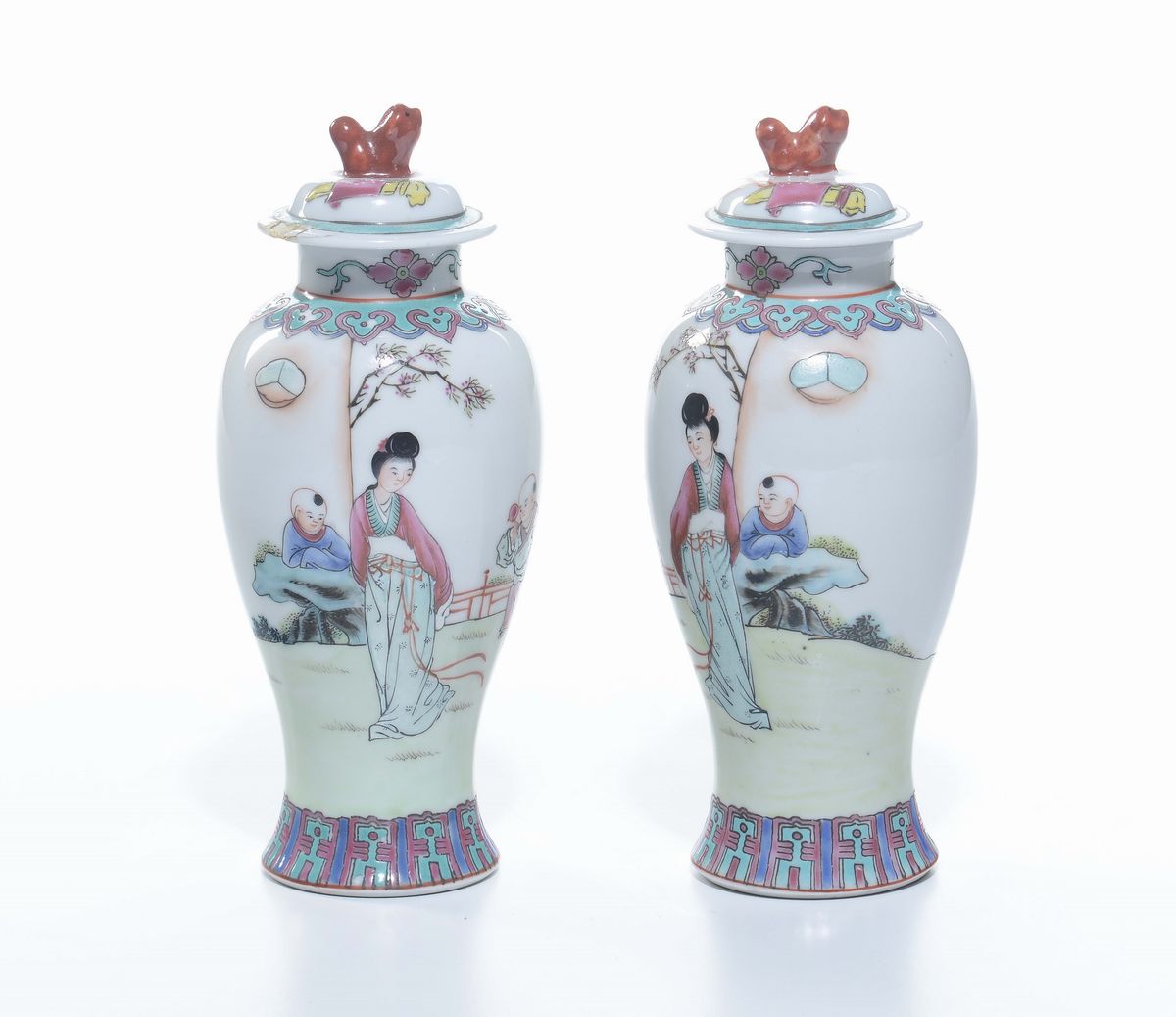 Coppia di vasi con coperchio in porcellana a smalti policromi, Cina, Dinastia Qing, XIX secolo