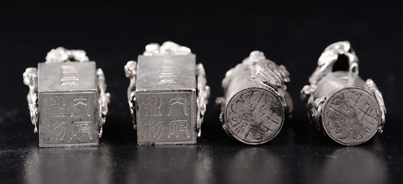Four silver seals with Pho dogs and inscriptions, China, Qing Dynasty, 19th century