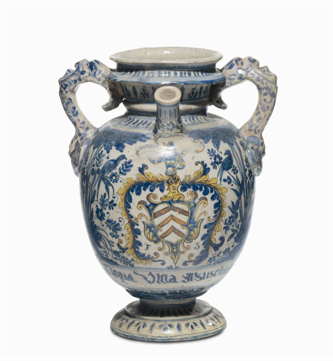 Idria in maiolica bianca e blu con stemma policromo, Savona fine XVIII secolo