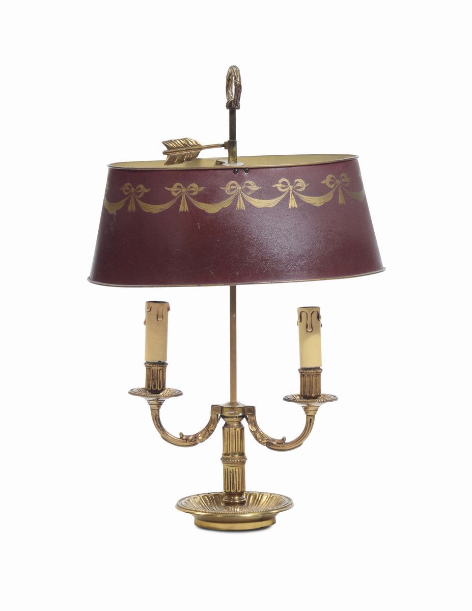 Lampada da tavolo in bronzo dorato a due luci, XIX secolo