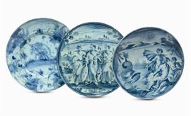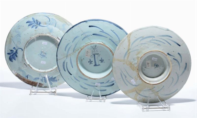 Lotto composto da due alzatine ed un piatto in maiolica bianca e blu, Savona, marca reale, marca corona e marca colonna