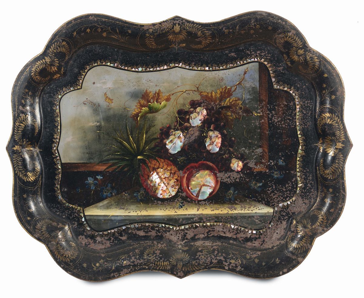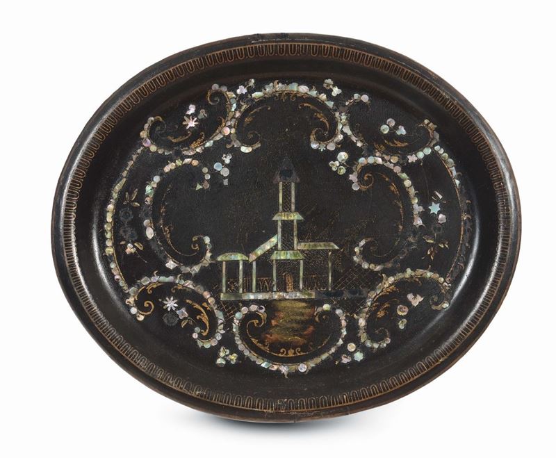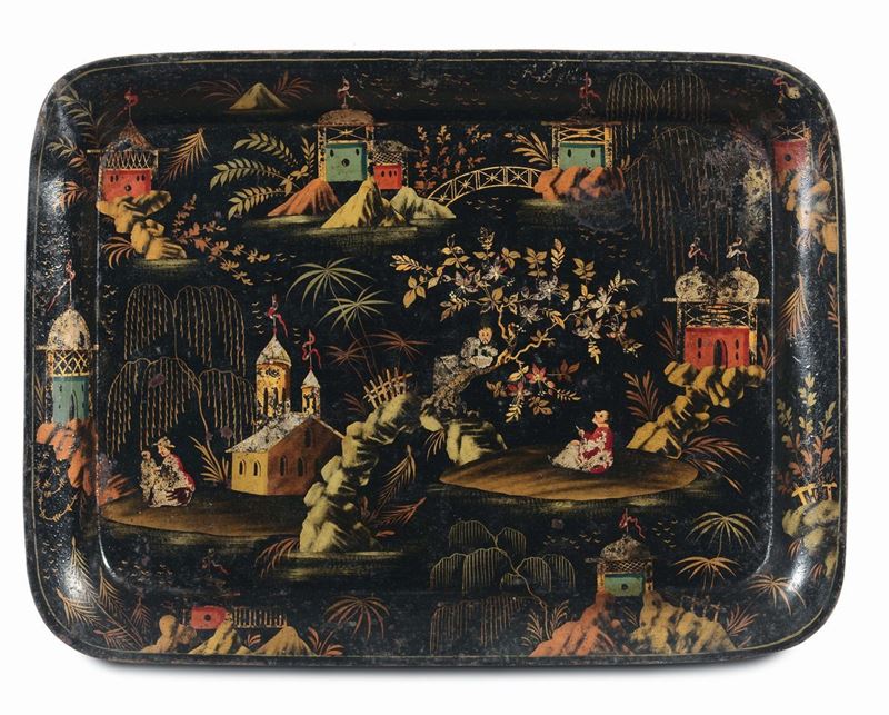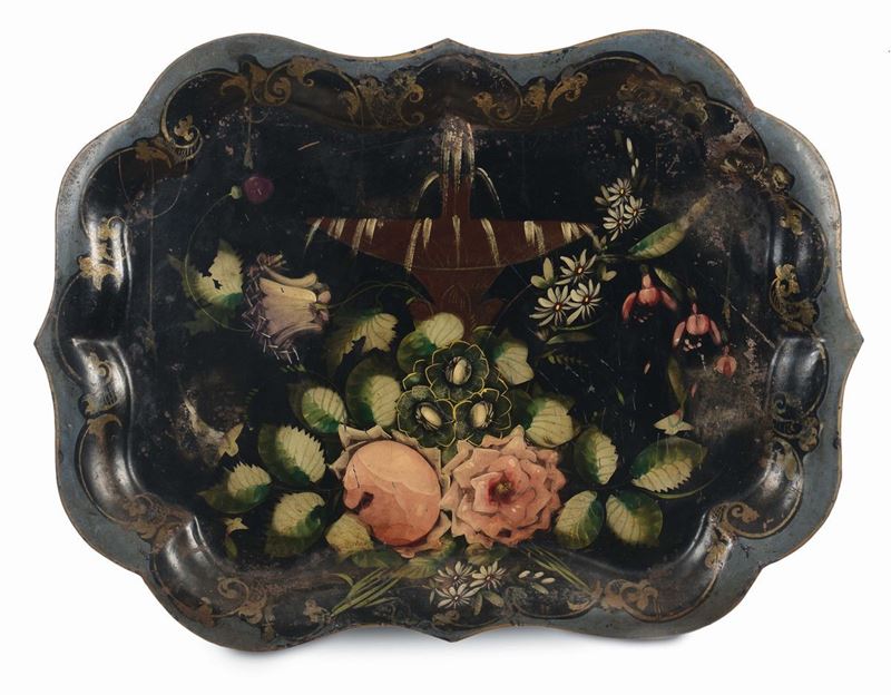 Lotto di cinque vassoi in metallo laccato, XVIII-XIX secolo
