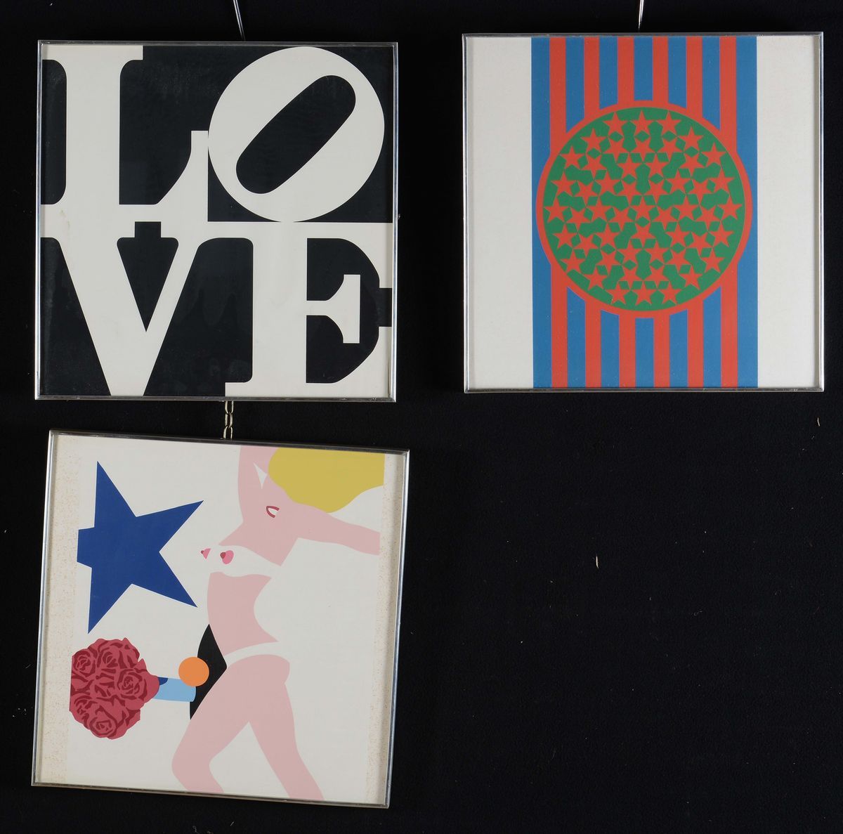 una di Wesselmann e due di Indiana, cm 38x38 cadauna