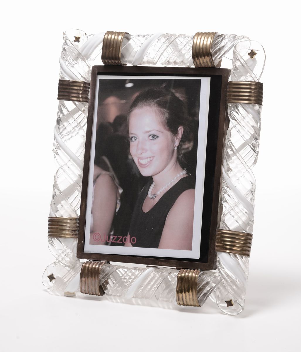 Portafoto in vetro con colature di vetro bianco. Struttura in ottone. Anni '50. Cm 44x37,5