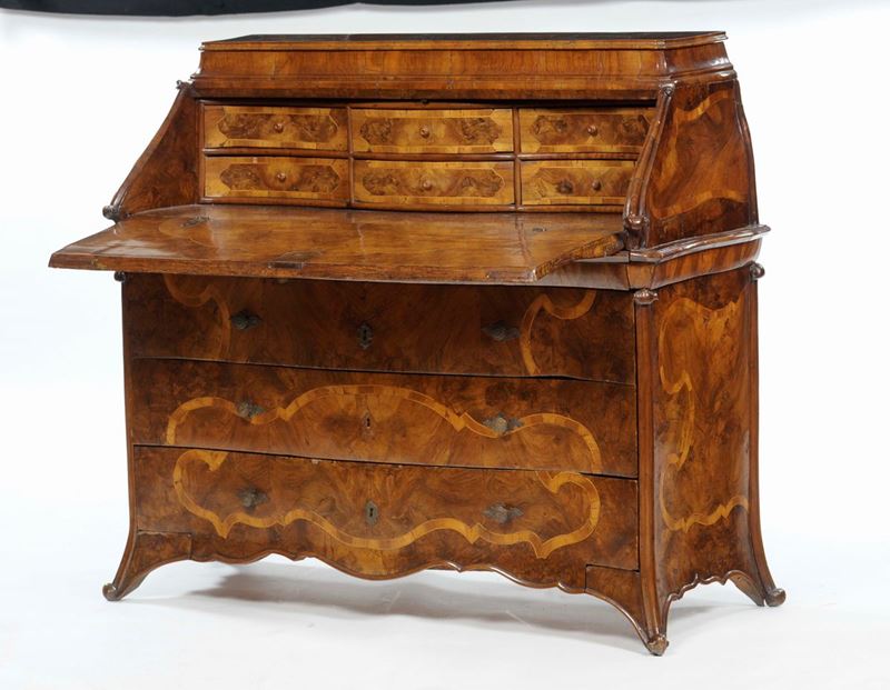 Ribalta interamente lastronata in radica di noce, decorata con spessa filetattura mistilinea, Lombardia o Veneto XVIII se [..]