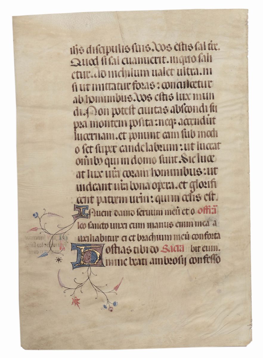 Pagina in pergamena con piccole iniziali miniate, cm 27x39,5