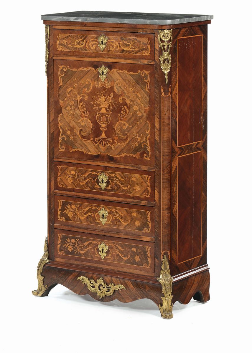 Secretaire interamente lastronato ed intarsiato in essenze varie, XIX secolo