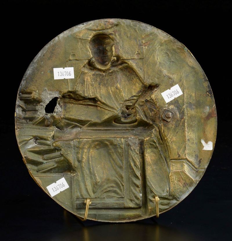 St Peter Martyr, gilt copper round plate, central Italian art, 17th century
