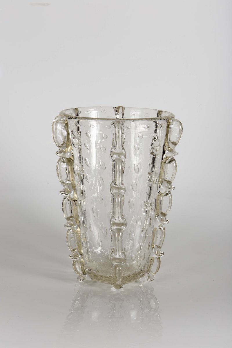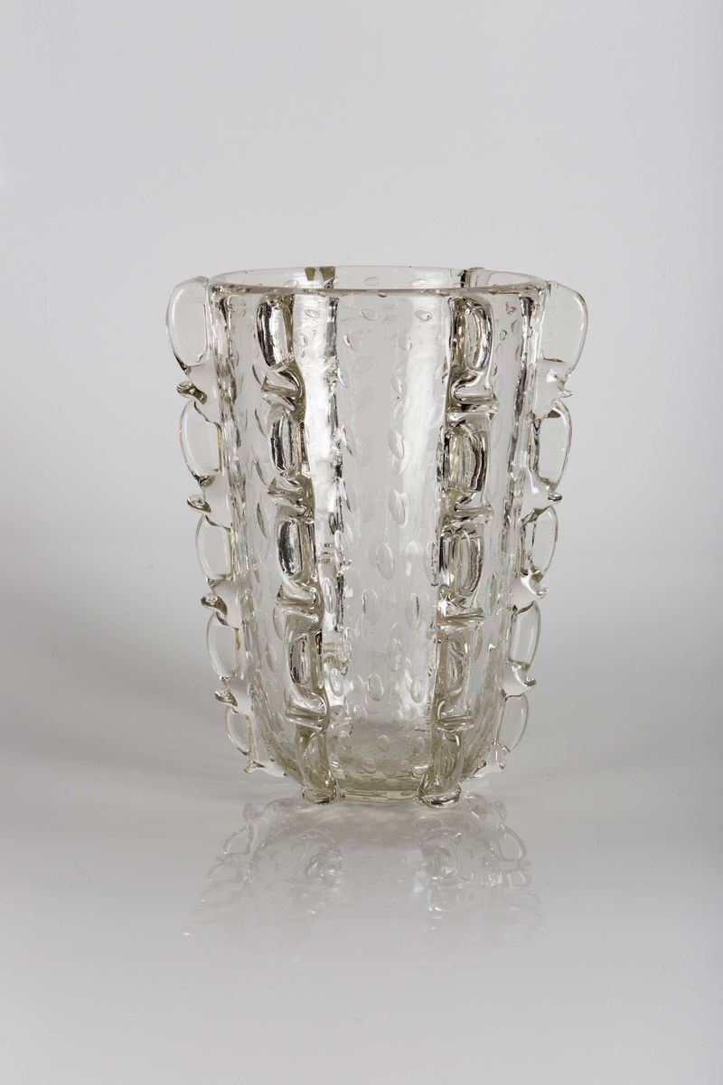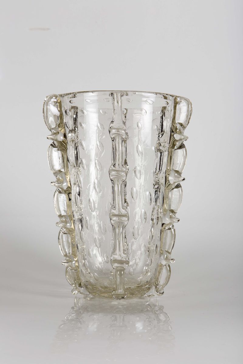 Grande vaso in vetro tronco conico a bolle con creste applicate. Altezza cm 38; diametro cm 24. Murano 1950 circa