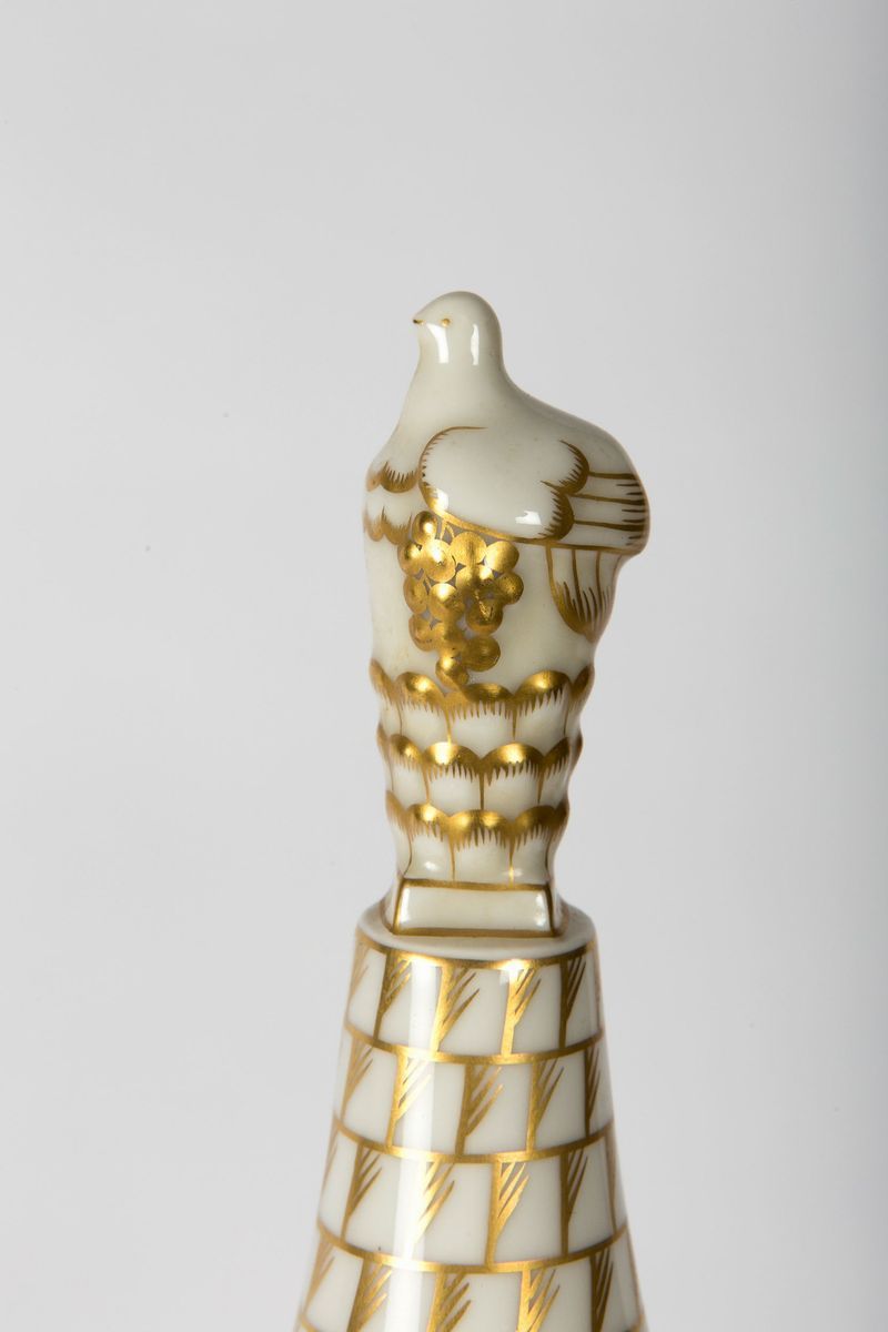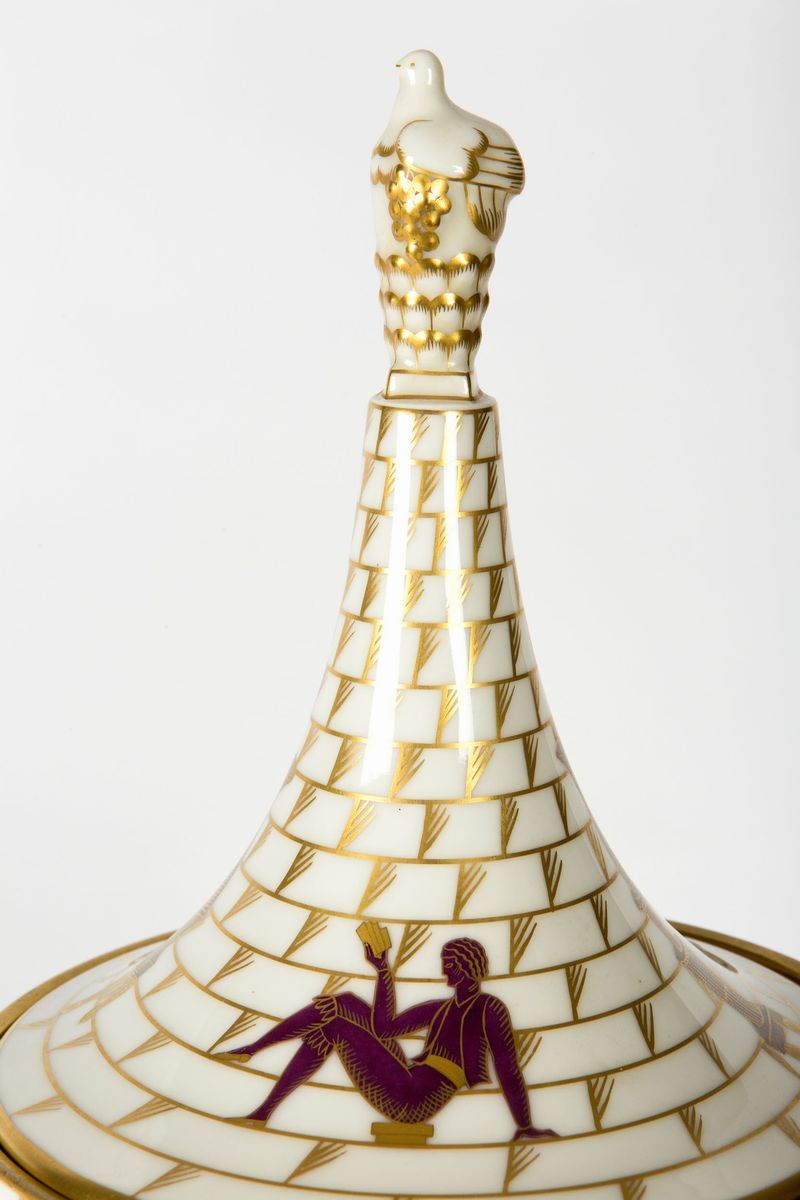 Vaso ad urna in porcellana bianca decorata in viola, grigio e oro. Marchi della manifattura e firma Gio'Ponti. Altezza cm 50. 1927 circa