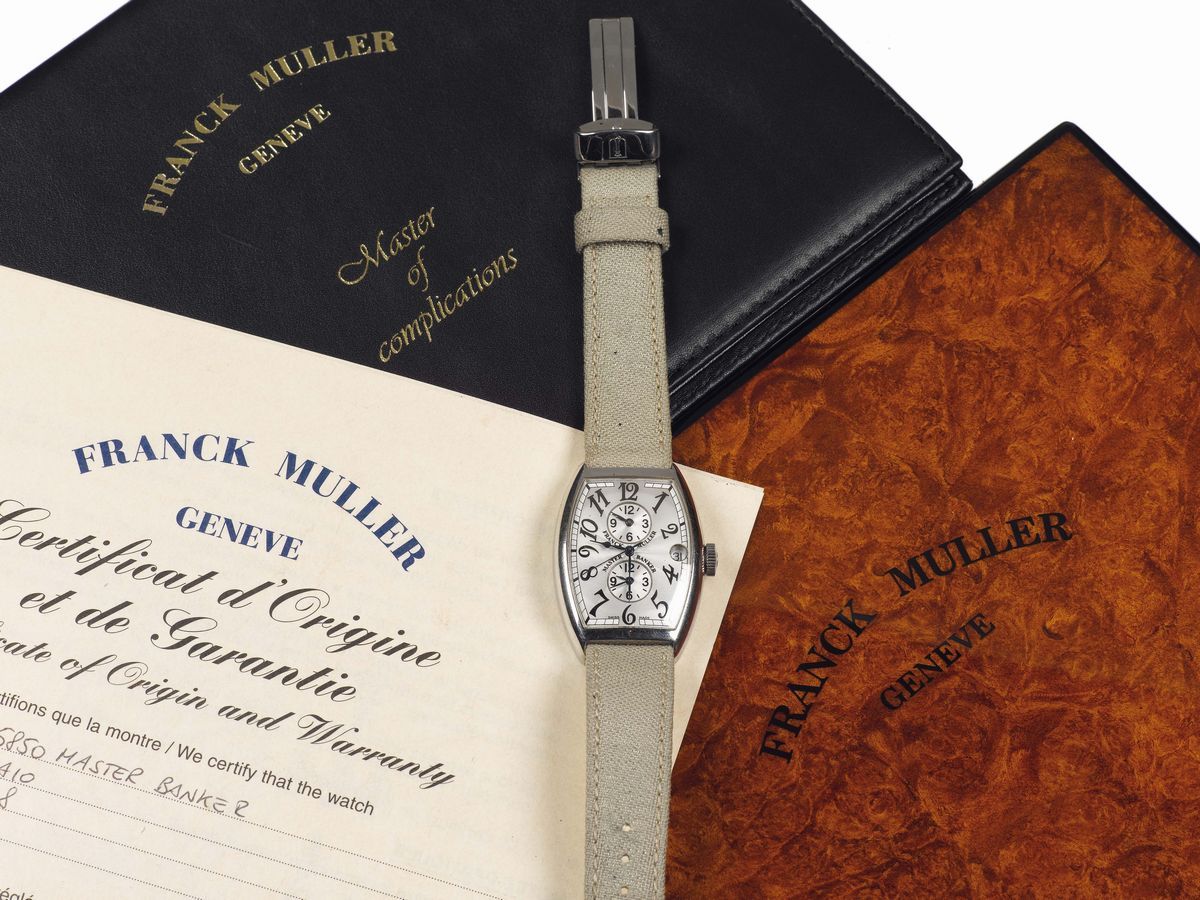 Franck Muller, Genève, Master Banker, No.1478, Ref. 5850 MB, tonneau-shaped and curved, center seconds, self-winding, water resistant, stainless steel wristwatch with 3 time zones, date and a stainless steel Franck Muller buckle. Made in the 2000's. Accompanied by the certificate and box.