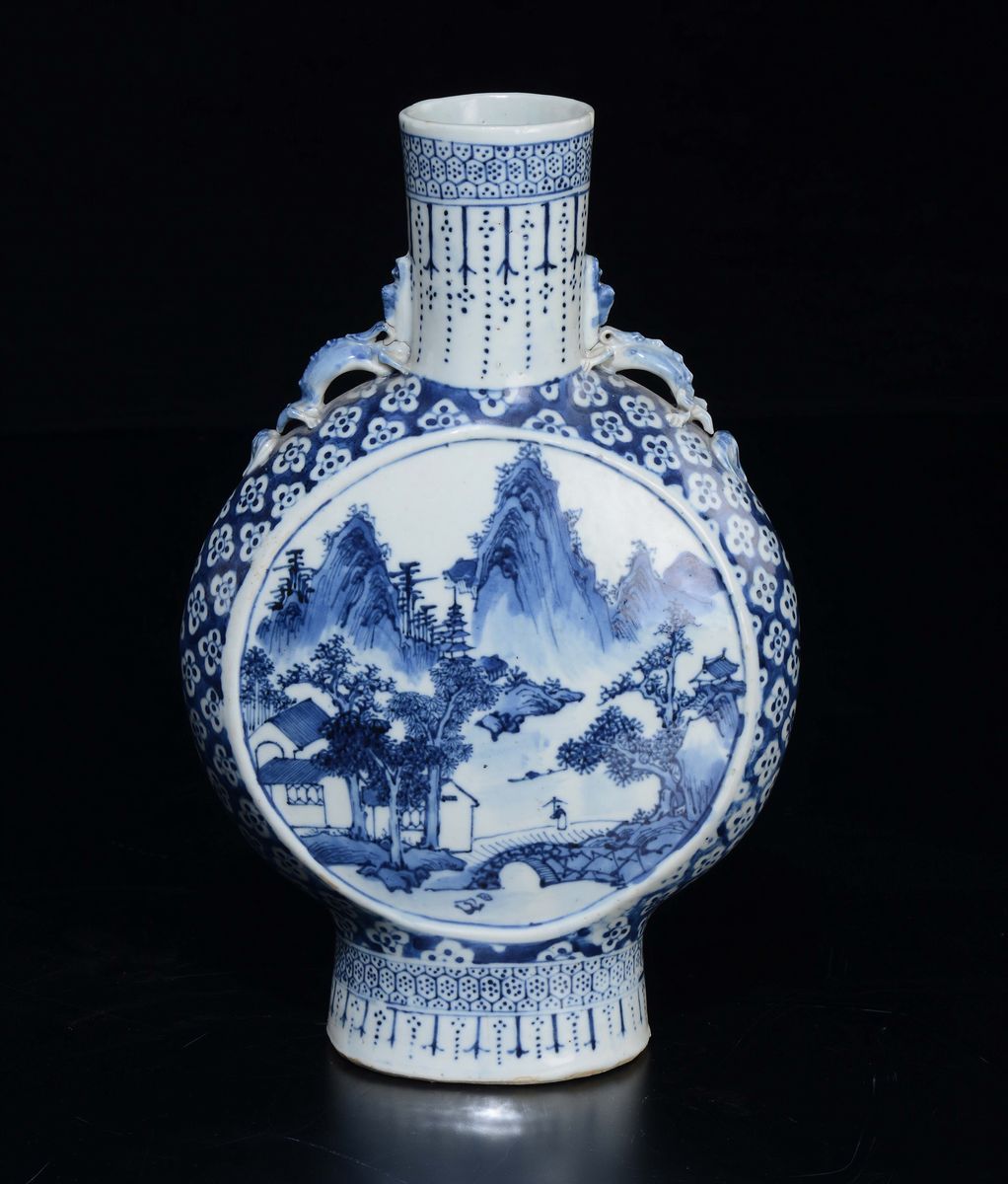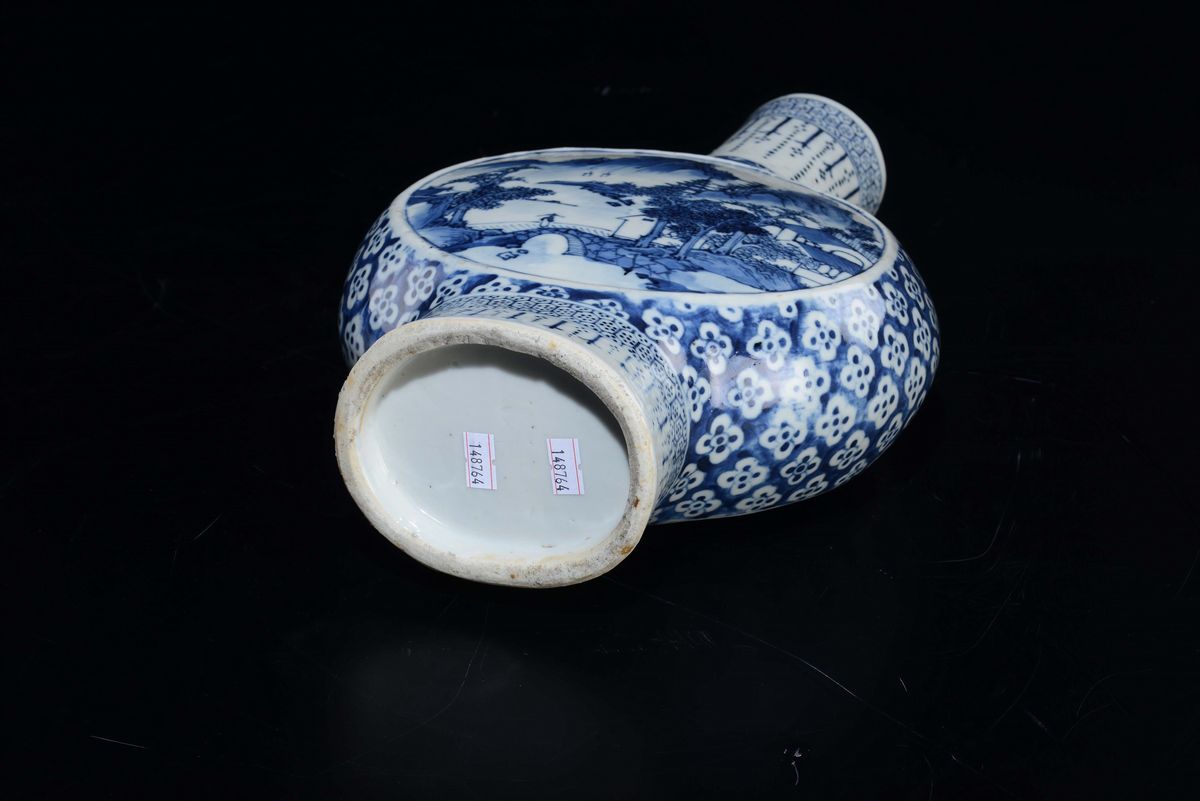 A blue and white flask depicting river landscapes within reserves, China, Qing Dynasty, 19th century