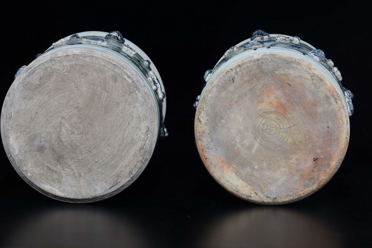 A pair of blue and white cachepots with naturalistic decorations in relief, China, 20th century