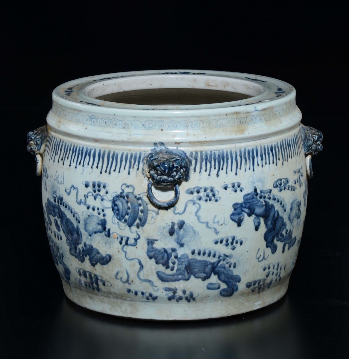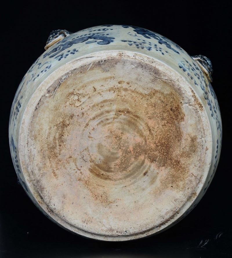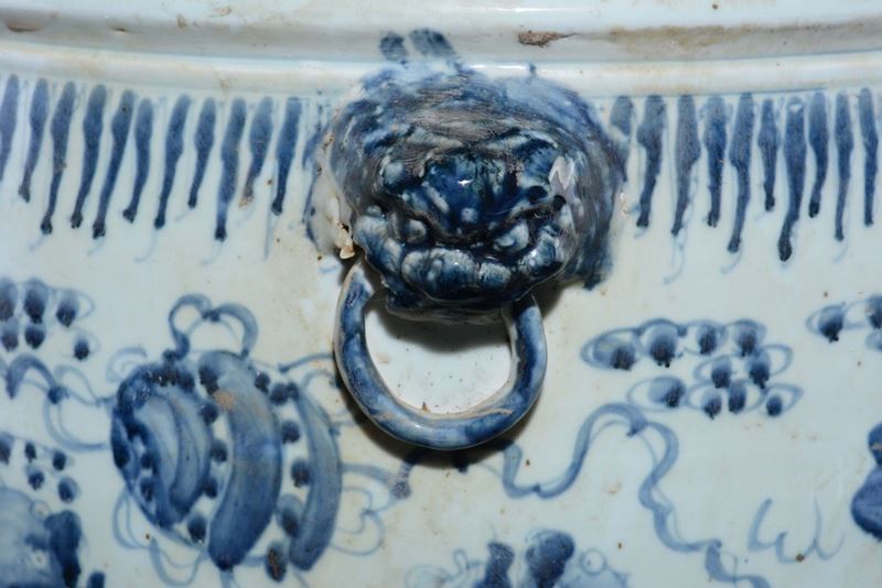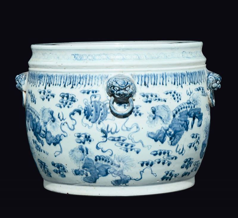 A pair of blue and white cachepots with ring-handles, China, 20th century