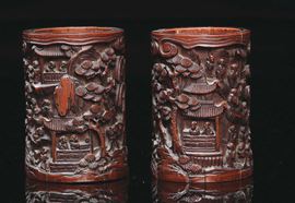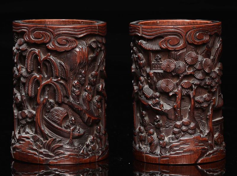 A pair of carved bamboo brushpots with landscape in relief, China, Qing Dynasty, 19th century