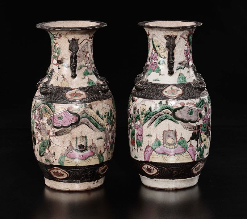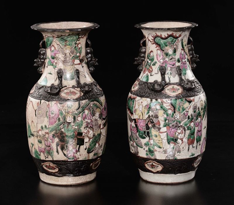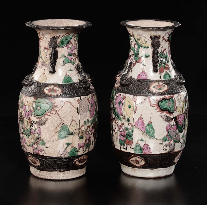A pair of craquelè polychrome enamelled porcelain vases with battle scenes, China, Qing Dynasty, 19th century