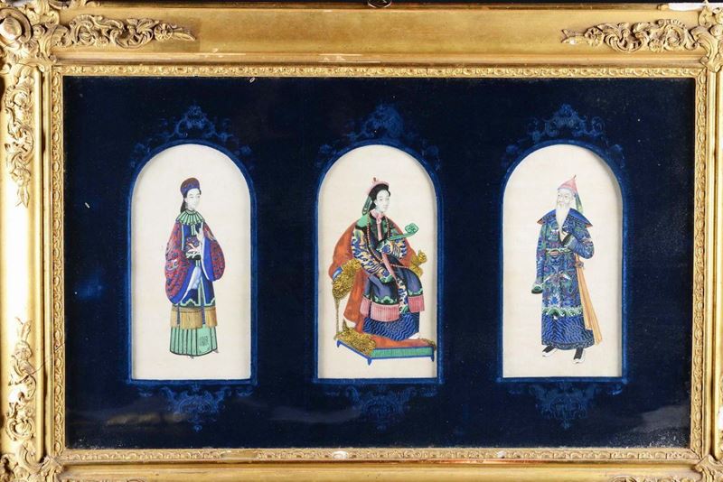 A pair of framed paintings with Guanyin and dignitaries, China, Qing Dynasty, 19th century