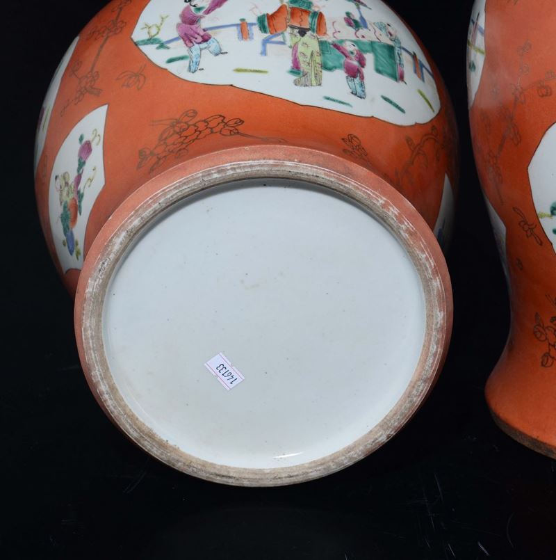 A pair of orange-ground porcelain potiches with children within reserves, China, early 20th century