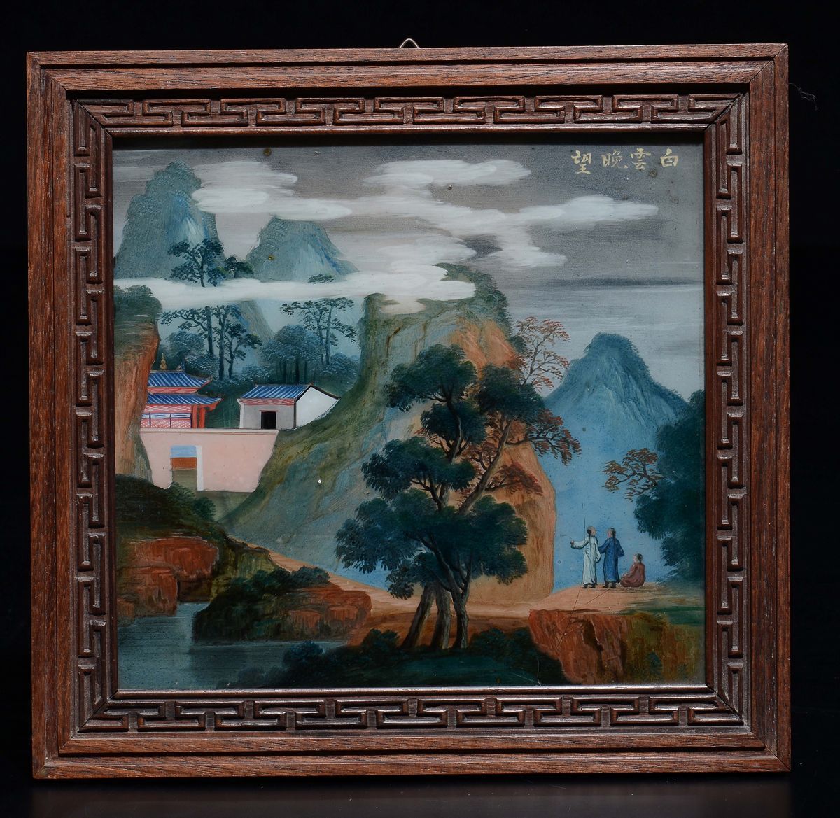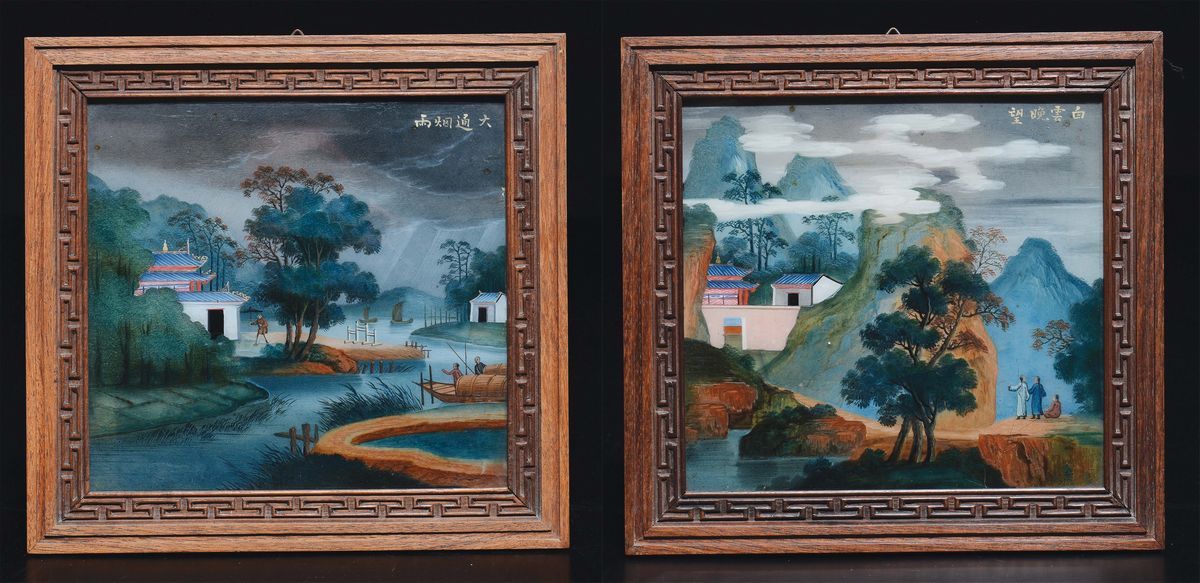 A pair of paintings on glass depicting river landscape with houses and figures and inscription, China, 20th century