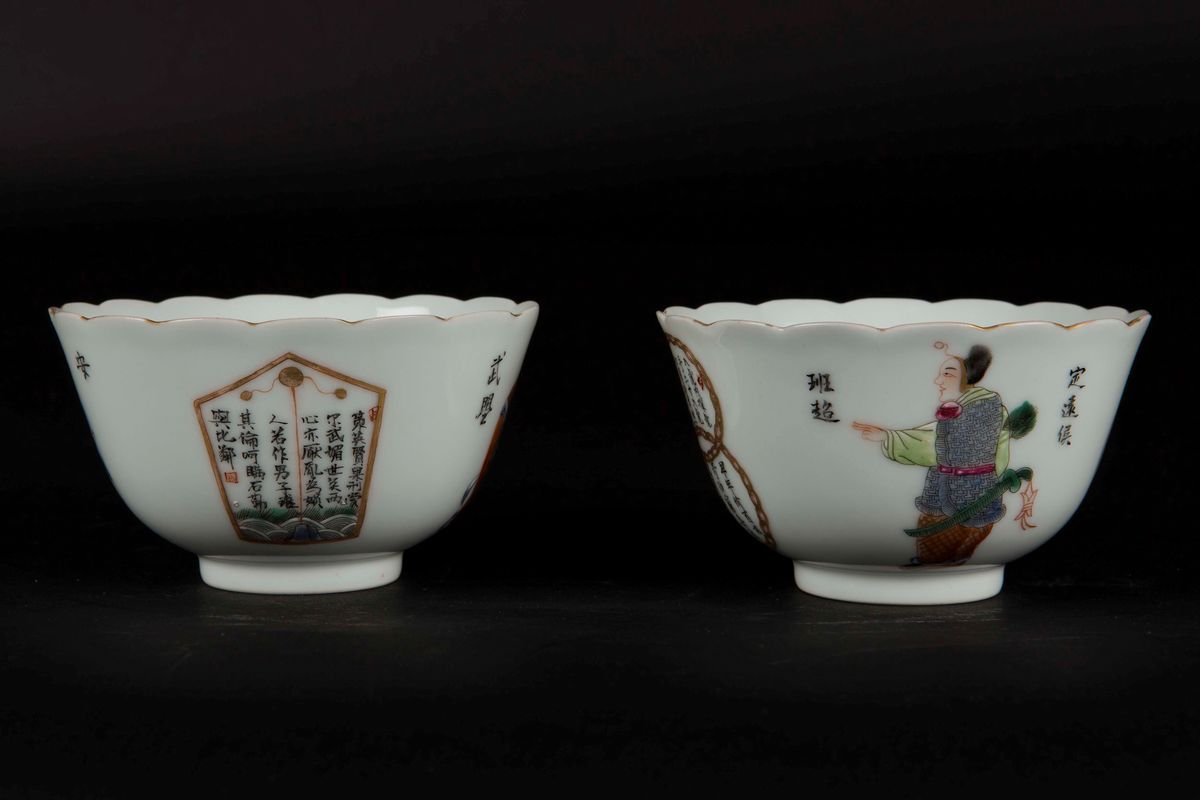 A pair of polychrome enamelled porcelain cups with dignitaries and inscriptions, China, Qing Dynasty, 19th century