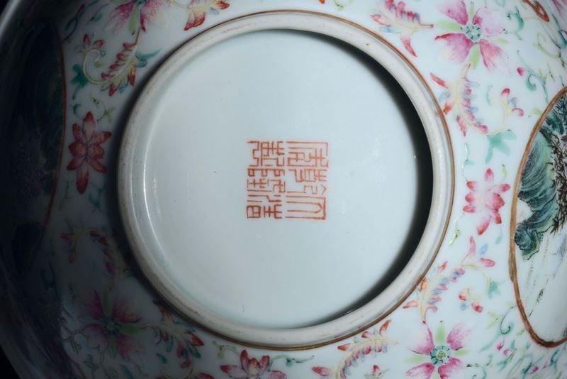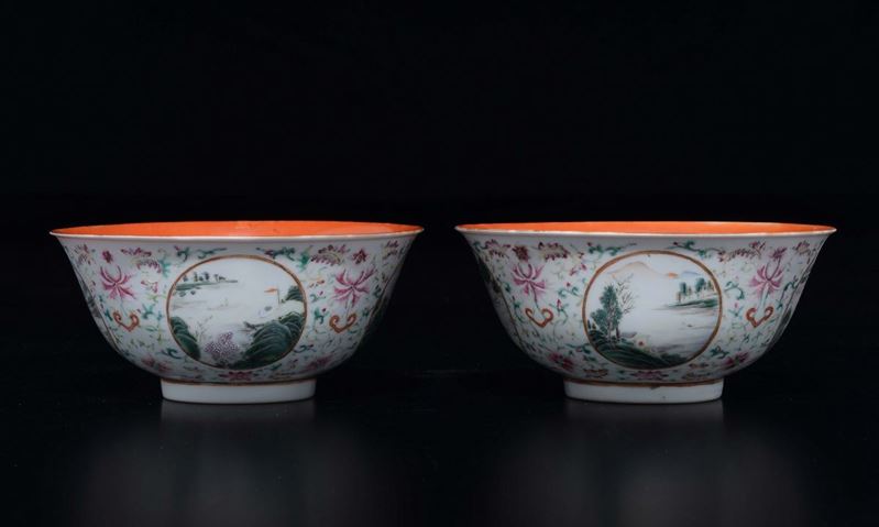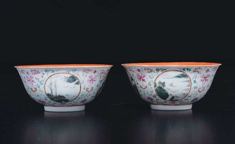 A pair of polychrome enamelled porcelain cups orange-ground with landscapes within reserves, China, Qing Dynasty, 19th ce [..]
